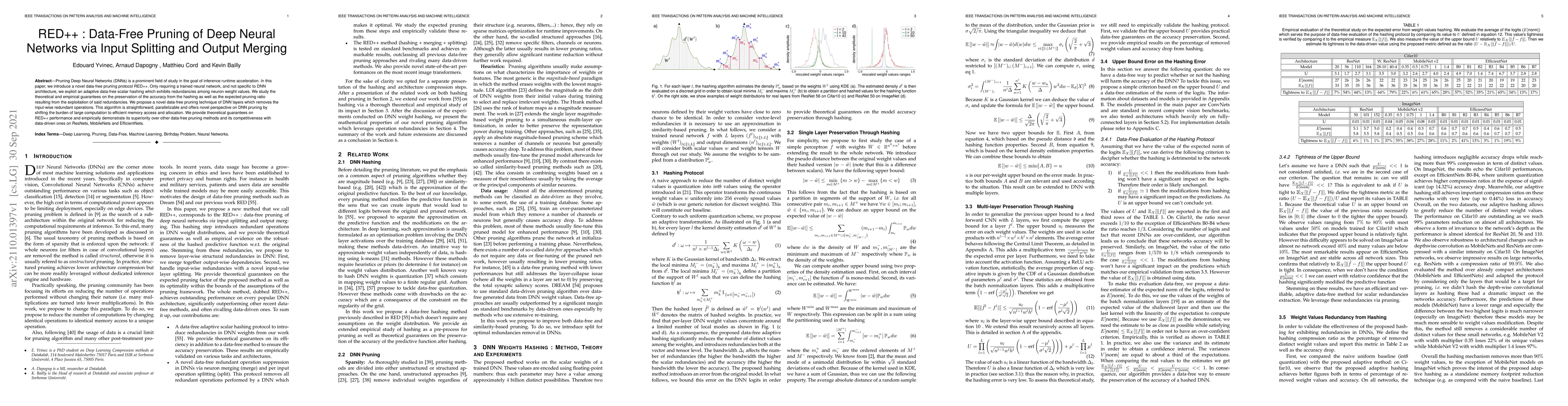 Pruning Deep Neural Networks (DNNs) is a prominent field of study in the goal of inference runtime acceleration. In this paper, we introduce a novel data-free pruning protocol RED++. Only requiring a trained neural network, and not specific to DNN architecture, we exploit an adaptive data-free scalar hashing which exhibits redundancies among neuron weight values. We study the theoretical and empirical guarantees on the preservation of the accuracy from the hashing as well as the expected pruning ratio resulting from the exploitation of said redundancies. We propose a novel data-free pruning technique of DNN layers which removes the input-wise redundant operations. This algorithm is straightforward, parallelizable and offers novel perspective on DNN pruning by shifting the burden of large computation to efficient memory access and allocation. We provide theoretical guarantees on RED++ performance and empirically demonstrate its superiority over other data-free pruning methods and its competitiveness with data-driven ones on ResNets, MobileNets and EfficientNets.