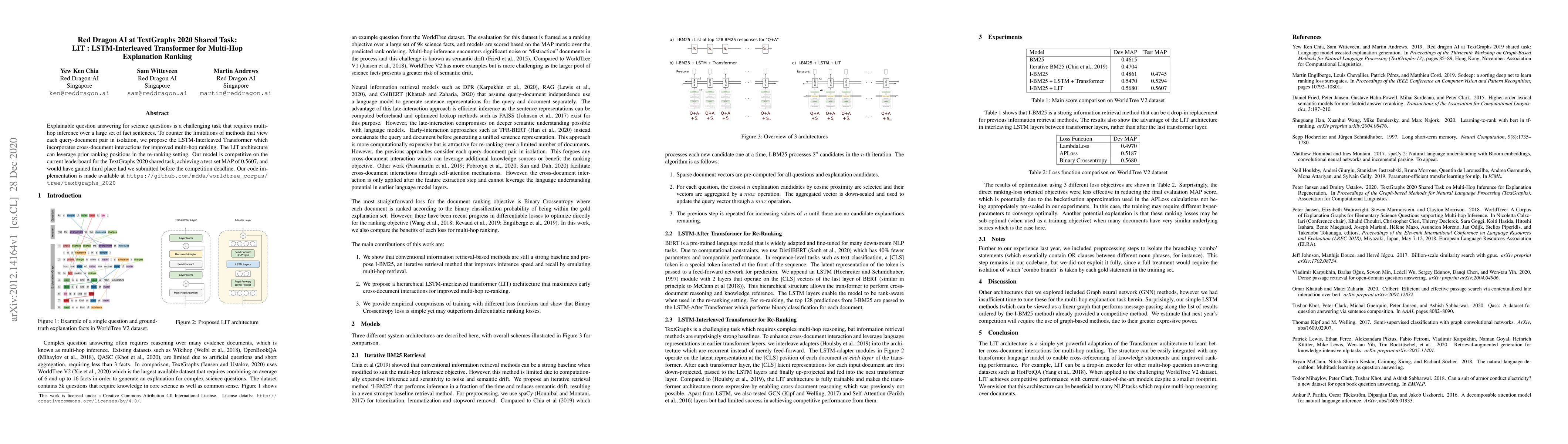 Explainable question answering for science questions is a challenging task that requires multi-hop inference over a large set of fact sentences. To counter the limitations of methods that view each query-document pair in isolation, we propose the LSTM-Interleaved Transformer which incorporates cross-document interactions for improved multi-hop ranking. The LIT architecture can leverage prior ranking positions in the re-ranking setting. Our model is competitive on the current leaderboard for the TextGraphs 2020 shared task, achieving a test-set MAP of 0.5607, and would have gained third place had we submitted before the competition deadline. Our code implementation is made available at https://github.com/mdda/worldtree_corpus/tree/textgraphs_2020