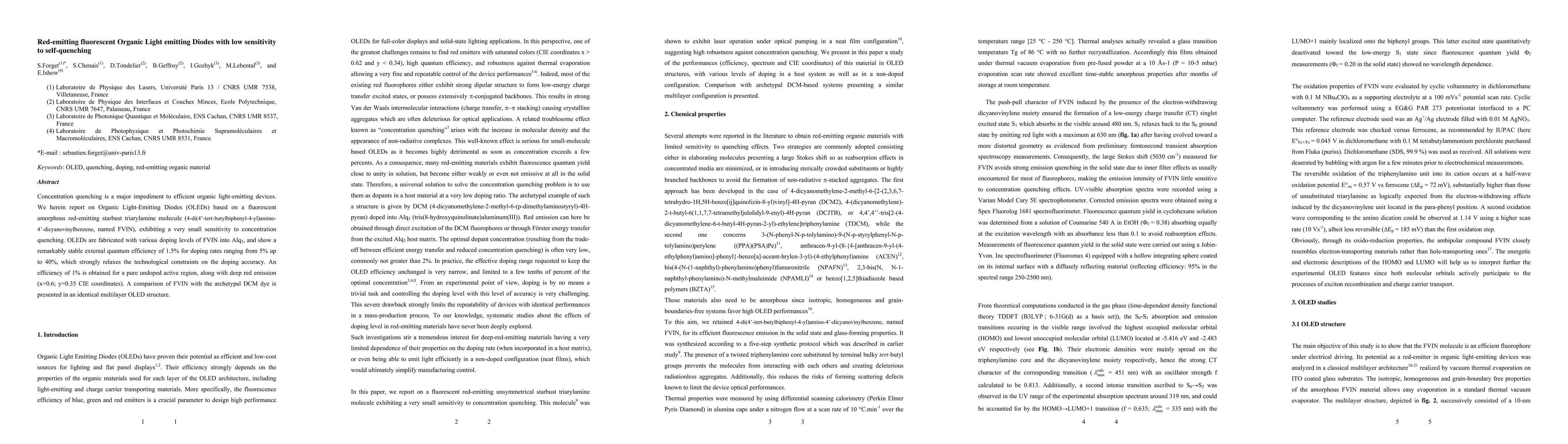 This paper reports on red-emitting OLEDs based on a starbust triarylamine molecule (FVIN) that shows minimal sensitivity to concentration quenching, maintaining stable external quantum efficiency up to 40% doping. The device achieves 1.5% efficiency across various doping levels and 1% in pure undoped regions, with deep red emission.