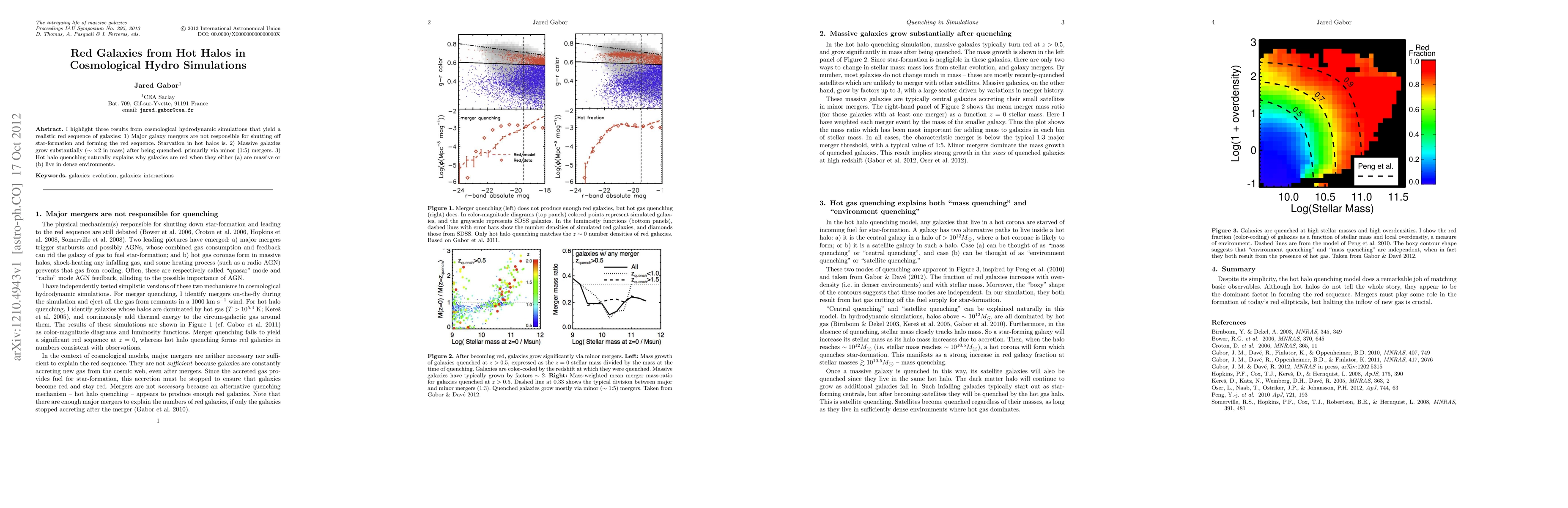 I highlight three results from cosmological hydrodynamic simulations that yield a realistic red sequence of galaxies: 1) Major galaxy mergers are not responsible for shutting off star-formation and forming the red sequence. Starvation in hot halos is. 2) Massive galaxies grow substantially (about a factor of 2 in mass) after being quenched, primarily via minor (1:5) mergers. 3) Hot halo quenching naturally explains why galaxies are red when they either (a) are massive or (b) live in dense environments.