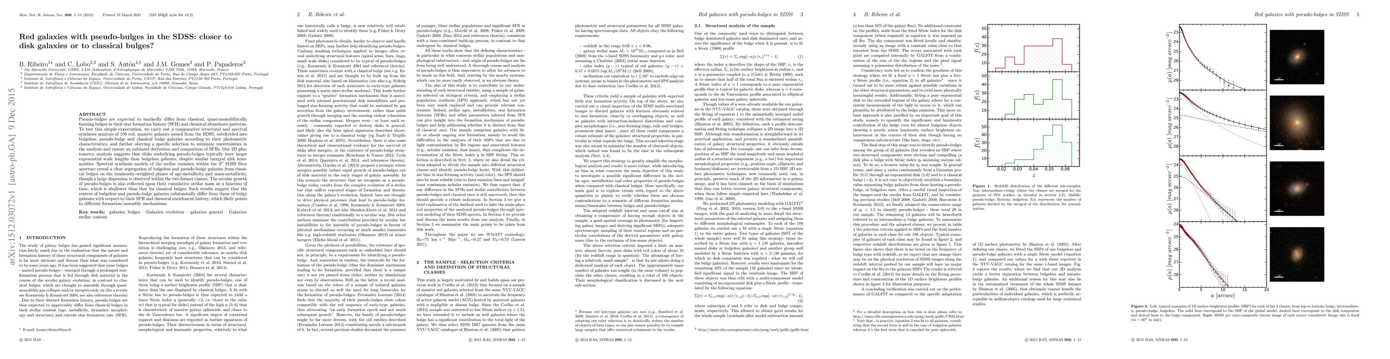 This study analyzes 106 red, massive galaxies from the SDSS to compare pseudo-bulges with classical bulges and bulgeless galaxies, finding that pseudo-bulges have larger disk scale lengths and distinct age-metallicity and mass-metallicity relationships, suggesting different formation mechanisms.