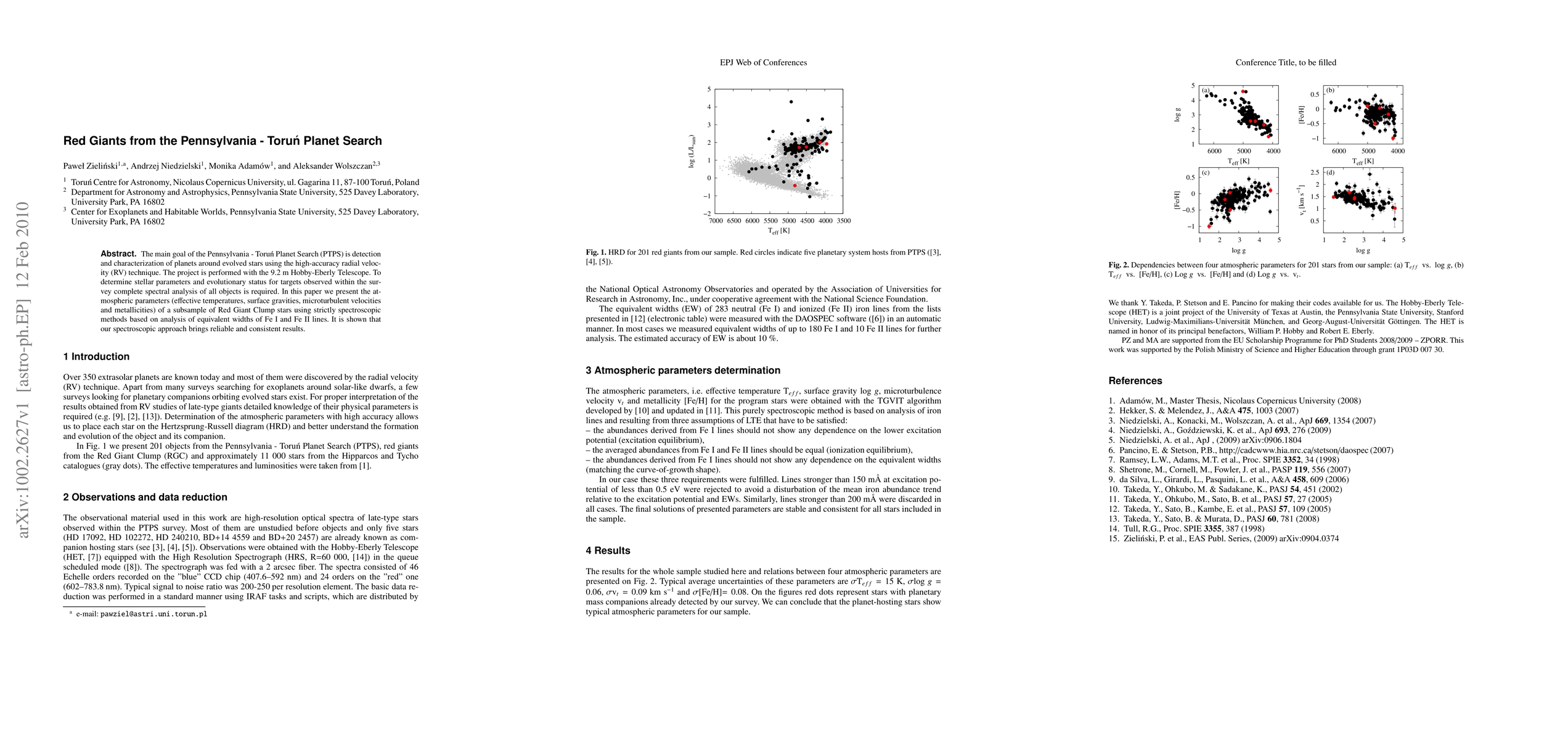 This paper presents the atmospheric parameters of a subsample of Red Giant Clump stars from the Pennsylvania-Torun Planet Search, using spectroscopic methods based on the analysis of Fe I and Fe II lines. The study demonstrates the reliability and consistency of the spectroscopic approach.