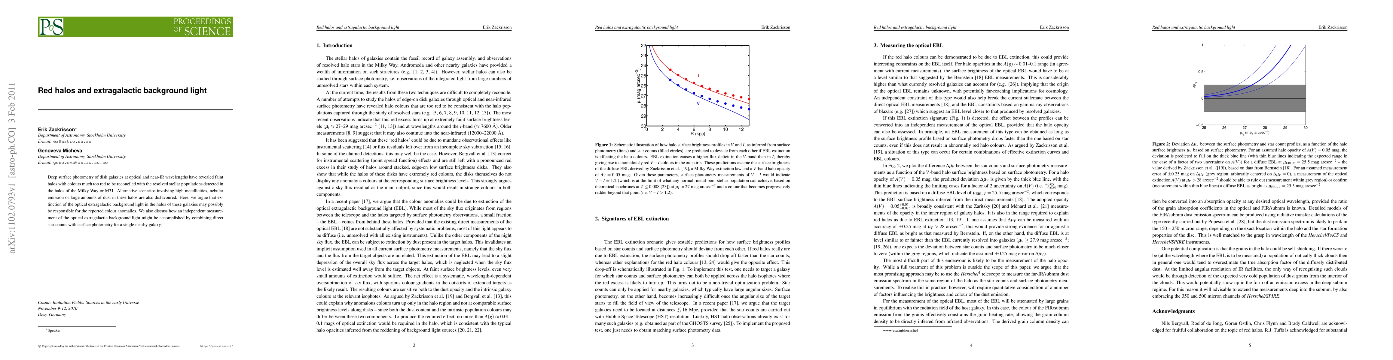 This paper investigates the red halos surrounding disk galaxies, suggesting that the anomalous colors may result from the extinction of optical extragalactic background light rather than high metallicities or dust. The authors propose a method to measure this background light by integrating direct star counts with surface photometry for a nearby galaxy.