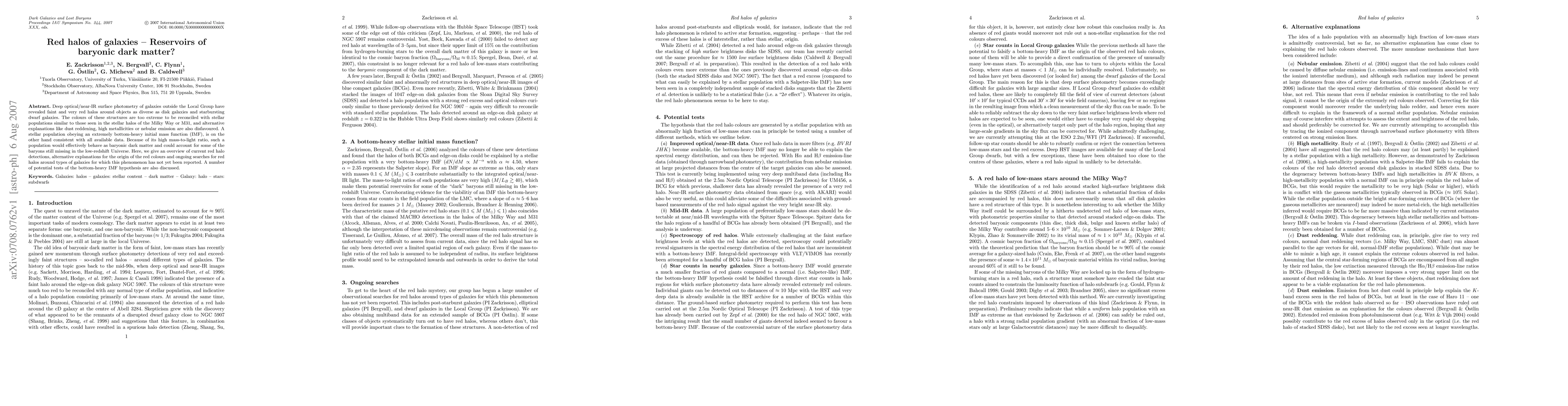 This paper explores the existence of faint, red halos around diverse galaxies, suggesting they may be composed of a stellar population with an extremely bottom-heavy initial mass function, potentially acting as baryonic dark matter. It discusses alternative explanations and ongoing searches for these red halos.