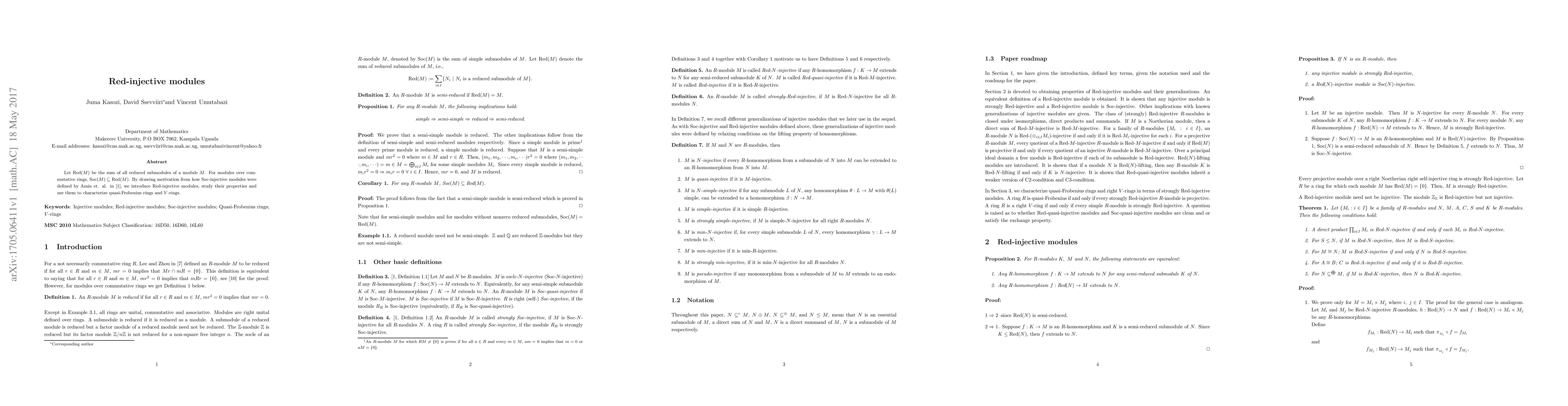 Summary: This paper introduces $\text{Red}$-injective modules, defined by the sum of all reduced submodules, and explores their properties, using them to characterize quasi-Frobenius rings and $V$-rings in modules over commutative rings.