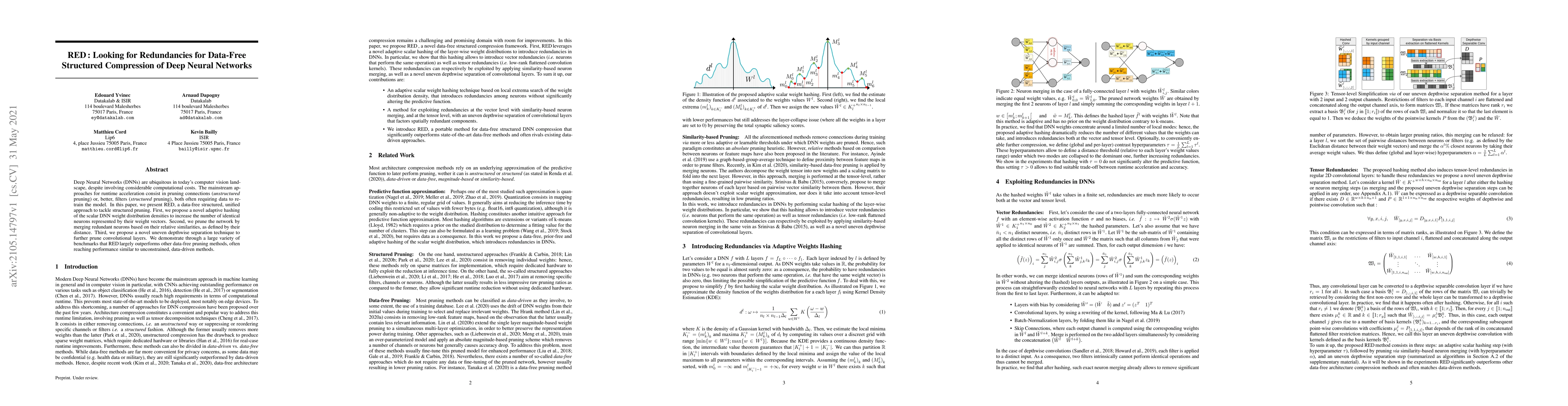 RED presents a data-free structured approach for compressing Deep Neural Networks by adaptively identifying and merging redundant neurons based on weight similarities and an uneven depthwise separation technique for convolutional layers. It outperforms other data-free methods and achieves performance comparable to data-driven approaches.
