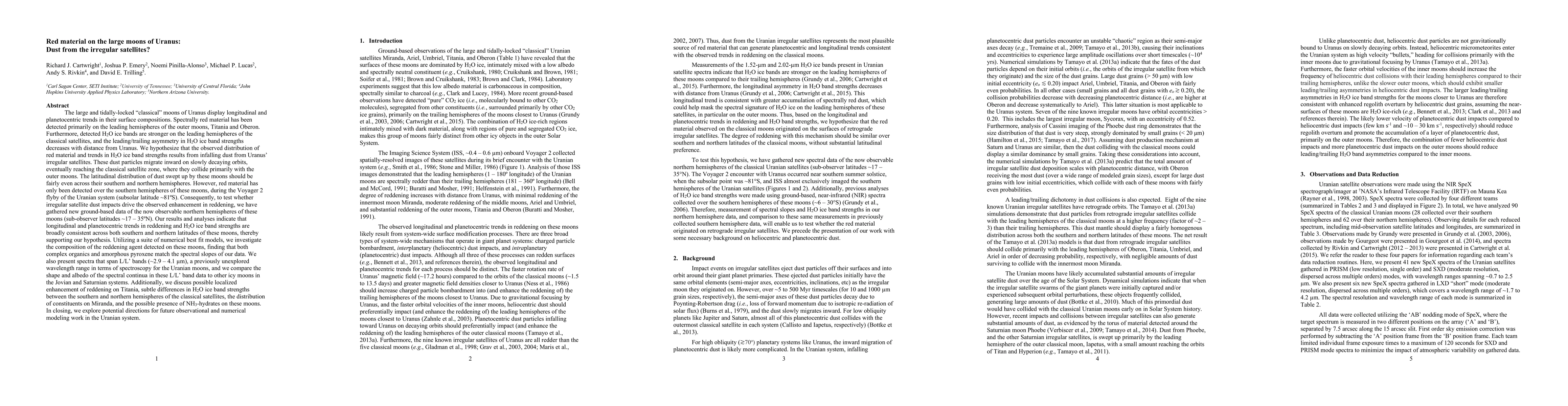 This research investigates the spectrally red material on Uranus' large moons, Titania and Oberon, suggesting it originates from dust from Uranian irregular satellites. New ground-based data supports the hypothesis that this dust migrates inward and impacts the moons, causing observed longitudinal and planetocentric trends in reddening and H2O ice band strengths.