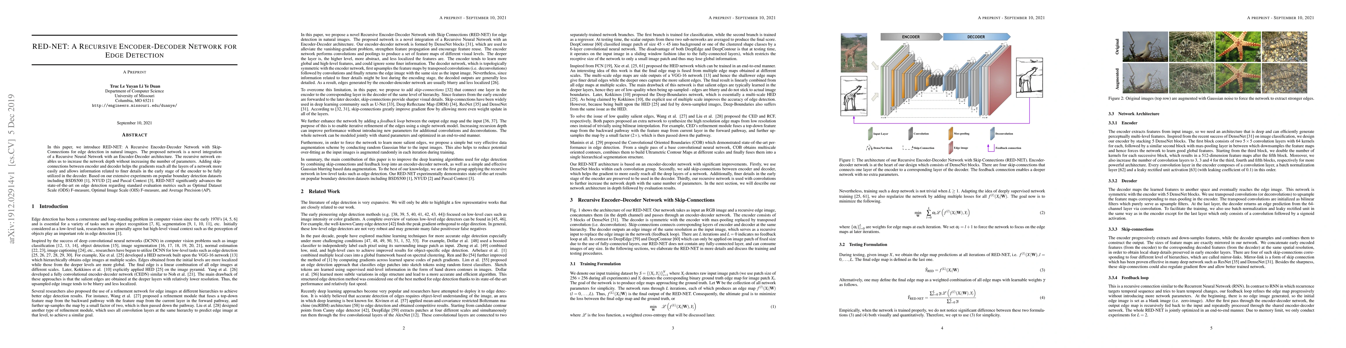 RED-NET is a novel Recursive Encoder-Decoder Network with skip-connections for edge detection in natural images, achieving state-of-the-art results on popular datasets by effectively utilizing finer details. The recursive structure allows for increased depth without parameter inflation, enhancing gradient flow and performance.