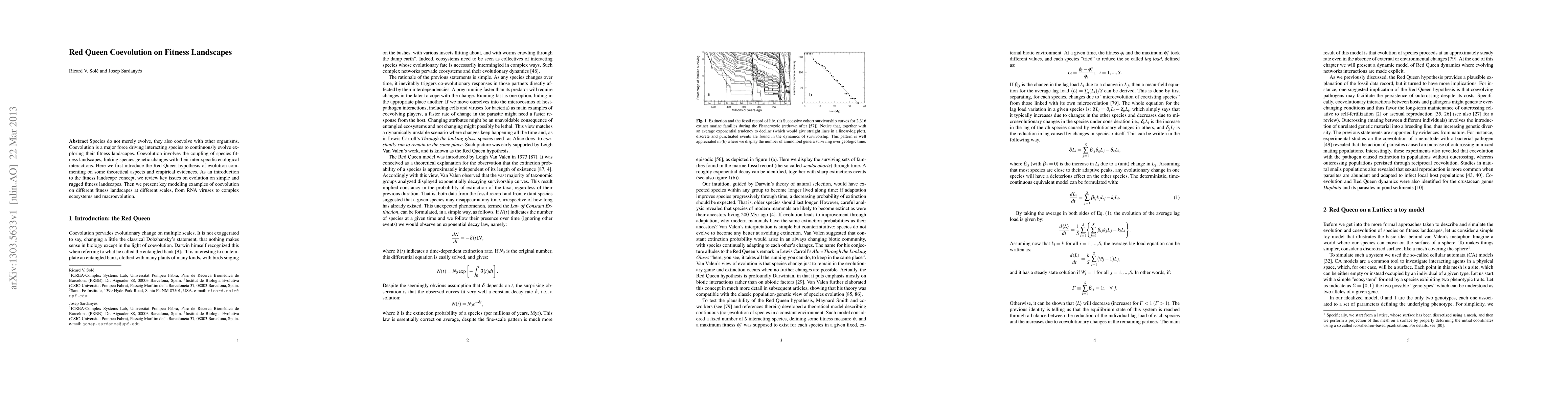 The paper introduces the Red Queen hypothesis and reviews fitness landscape concepts, presenting modeling examples of coevolution on different landscapes at various scales, from RNA viruses to complex ecosystems and macroevolution.