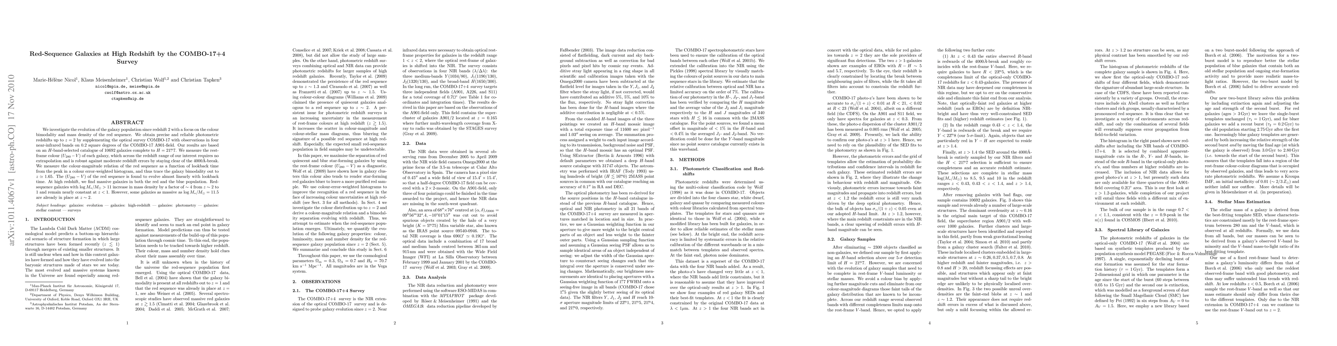 This study examines the evolution of red-sequence galaxies up to redshift z=2 using the COMBO-17+4 Survey, revealing a nearly linear evolution of their rest-frame colour with lookback time. The mass density of massive red-sequence galaxies increases significantly from z~2 to 1 but remains stable at lower redshifts.