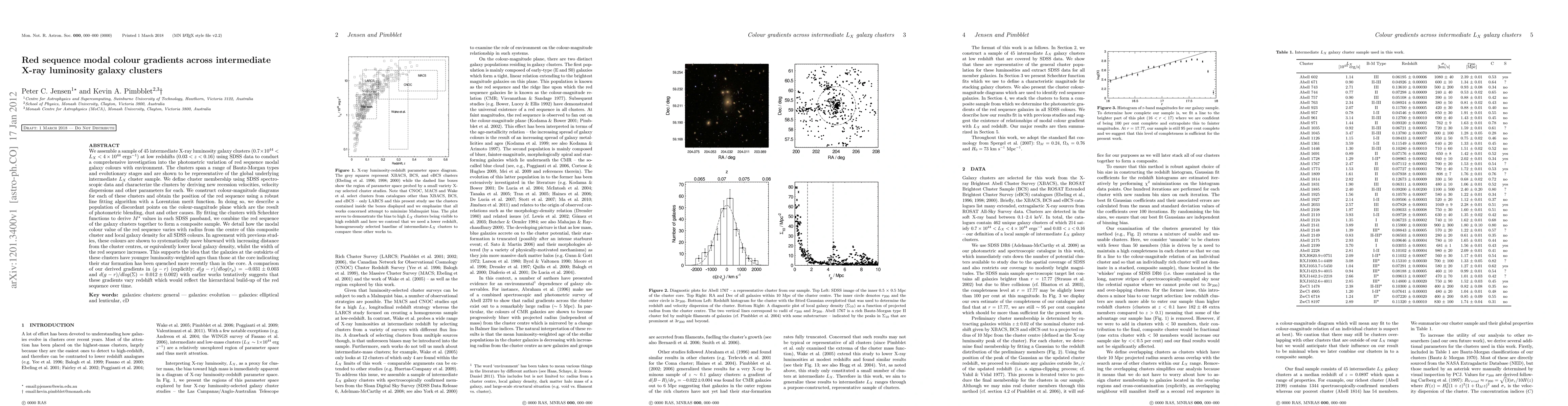 [Abridged] We assemble a sample of 45 intermediate X-ray luminosity galaxy clusters at low redshifts using SDSS data to conduct a comprehensive investigation into the photometric variation of red sequence modal galaxy colours with environment. The clusters span a range of Bautz-Morgan types and evolutionary stages and are representative of the global underlying intermediate L_X cluster sample. We define cluster membership using SDSS spectroscopic data and characterize the clusters by deriving new recession velocities, velocity dispersions and other parameters for each. We construct colour-magnitude diagrams for each of these clusters and obtain the position of the red sequence using a robust line fitting algorithm with a Lorentzian merit function. In doing so, we describe a population of discordant points on the colour-magnitude plane which are the result of photometric blending, dust and other causes. By fitting the clusters with Schechter functions to derive M* values in each SDSS passband, we combine the red sequence of the galaxy clusters together to form a composite sample. We detail how the modal colour value of the red sequence varies with radius from the centre of this composite cluster and local galaxy density for all SDSS colours. In agreement with previous studies, these colours are shown to systematically move blueward with increasing distance from the cluster centres, or equivalently lower local galaxy density, whilst the width of the red sequence increases. This supports the idea that the galaxies at the outskirts of these clusters have younger luminosity-weighted ages than those at the core indicating their star formation has been quenched more recently than in the core. A comparison of our derived gradients in (g-r) with earlier works tentatively suggests that these gradients vary with redshift which would reflect the hierarchical build-up of the red sequence over time.