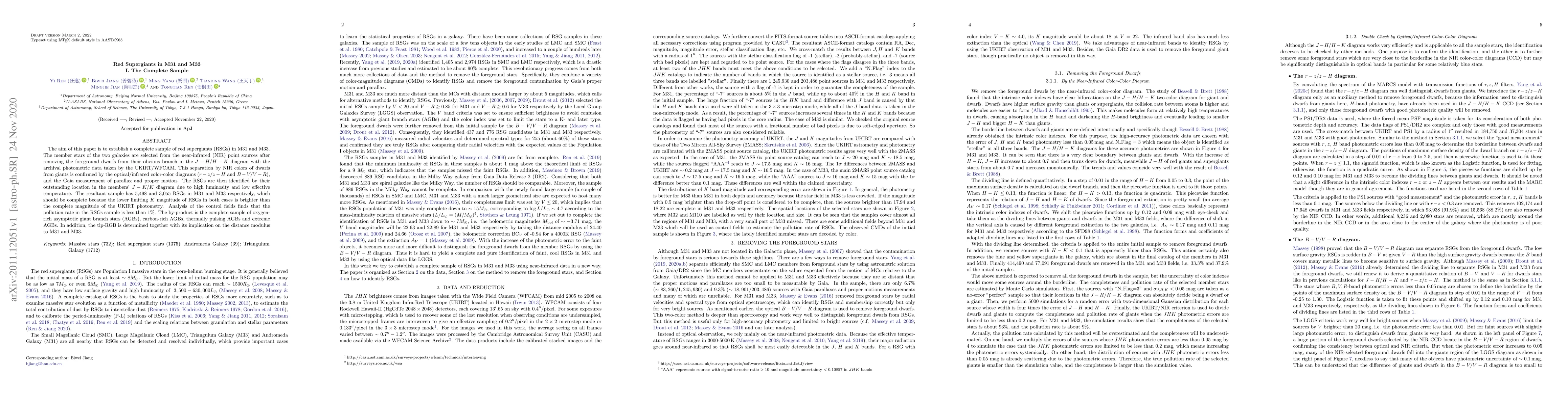 This paper establishes a complete sample of red supergiants (RSGs) in M31 and M33 using near-infrared data from UKIRT/WFCAM, distinguishing RSGs by their unique $J-K/K$ diagram positions. The sample includes 5,498 RSGs in M31 and 3,055 in M33, confirmed to be complete and with less than 1% pollution.