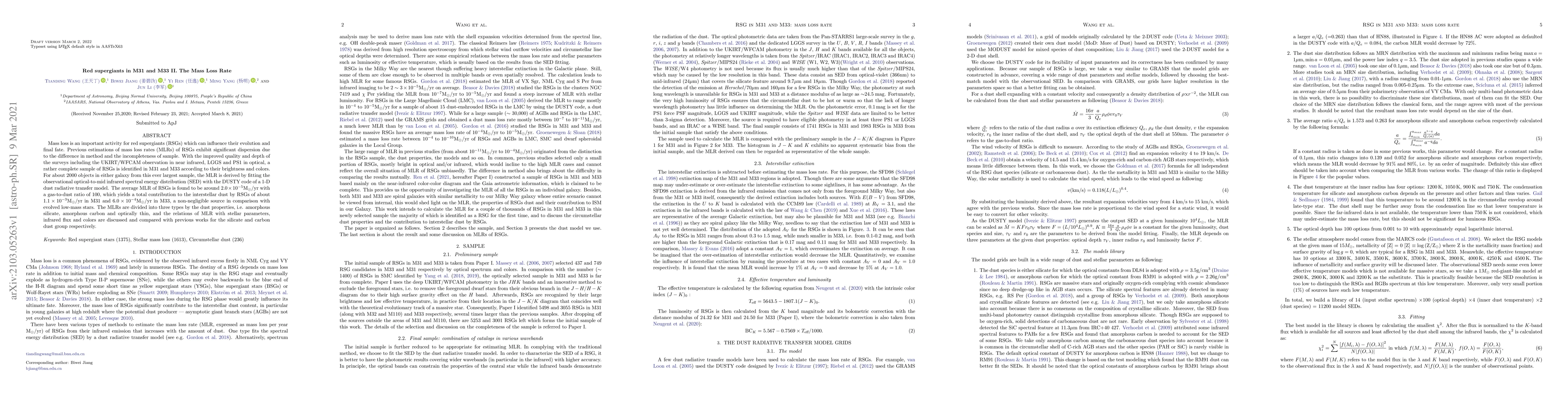 This paper investigates the mass loss rates (MLRs) of red supergiants (RSGs) in M31 and M33 using a comprehensive sample derived from improved observational data. The average MLR is found to be around $2.0\times10^{-5}{\text{M}_\odot}/\text{yr}$, contributing significantly to interstellar dust formation.