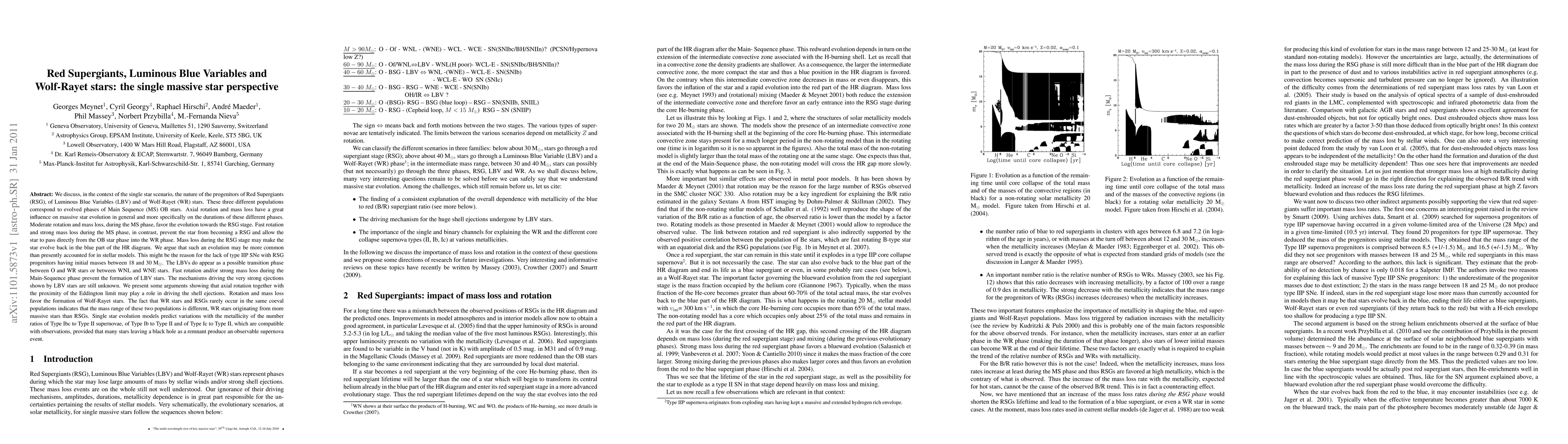 This paper explores the evolutionary paths of Red Supergiants (RSG), Luminous Blue Variables (LBV), and Wolf-Rayet (WR) stars within the framework of single massive stars, emphasizing the roles of axial rotation and mass loss. It suggests that moderate rotation and mass loss favor RSG evolution, while fast rotation and strong mass loss lead directly to WR stars, bypassing RSG and LBV stages.
