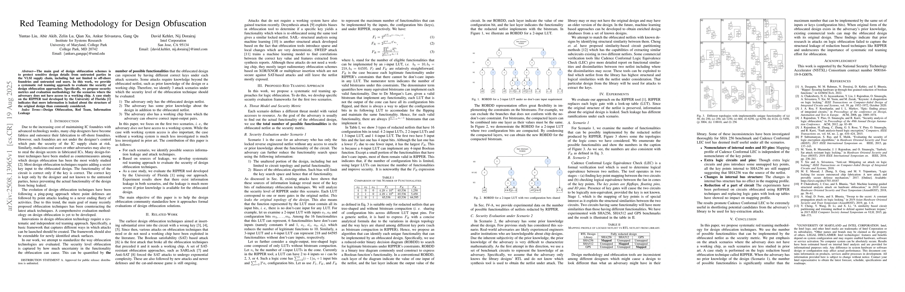 The main goal of design obfuscation schemes is to protect sensitive design details from untrusted parties in the VLSI supply chain, including but not limited to off-shore foundries and untrusted end users. In this work, we provide a systematic red teaming approach to evaluate the security of design obfuscation approaches. Specifically, we propose security metrics and evaluation methodology for the scenarios where the adversary does not have access to a working chip. A case study on the RIPPER tool developed by the University of Florida indicates that more information is leaked about the structure of the original design than commonly considered.