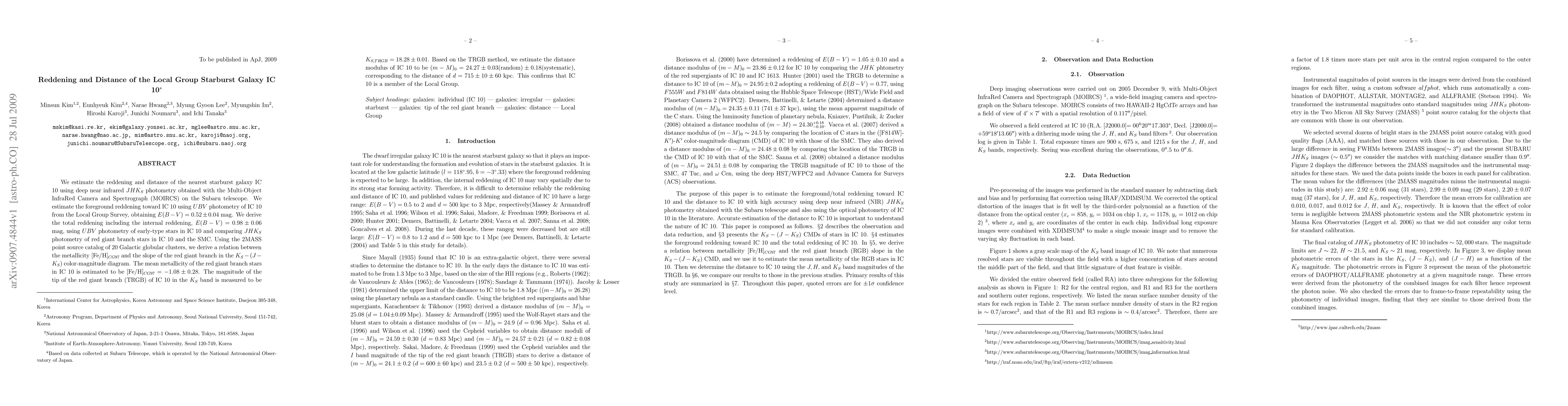 We estimate the reddening and distance of the nearest starburst galaxy IC 10 using deep near infrared $JHK_{S}$ photometry obtained with the Multi-Object InfraRed Camera and Spectrograph (MOIRCS) on the Subaru telescope. We estimate the foreground reddening toward IC 10 using $UBV$ photometry of IC 10 from the Local Group Survey, obtaining $E(B-V)=0.52\pm 0.04$ mag. We derive the total reddening including the internal reddening, $E(B-V)=0.98\pm 0.06$ mag, using $UBV$ photometry of early-type stars in IC 10 and comparing $JHK_{S}$ photometry of red giant branch stars in IC 10 and the SMC. Using the 2MASS point source catalog of 20 Galactic globular clusters, we derive a relation between the metallicity [Fe/H]$_{CG97}$ and the slope of the red giant branch in the $K_{S}- (J-K_{S})$ color-magnitude diagram. The mean metallicity of the red giant branch stars in IC 10 is estimated to be [Fe/H]$_{CG97}=-1.08\pm0.28$. The magnitude of the tip of the red giant branch (TRGB) of IC 10 in the $K_{S}$ band is measured to be $K_{S,TRGB}=18.28\pm0.01$. Based on the TRGB method, we estimate the distance modulus of IC 10 to be $(m-M)_{0}=24.27\pm0.03{\rm (random)}\pm0.18{\rm (systematic)}$, corresponding to the distance of $d=715\pm10\pm60$ kpc. This confirms that IC 10 is a member of the Local Group.