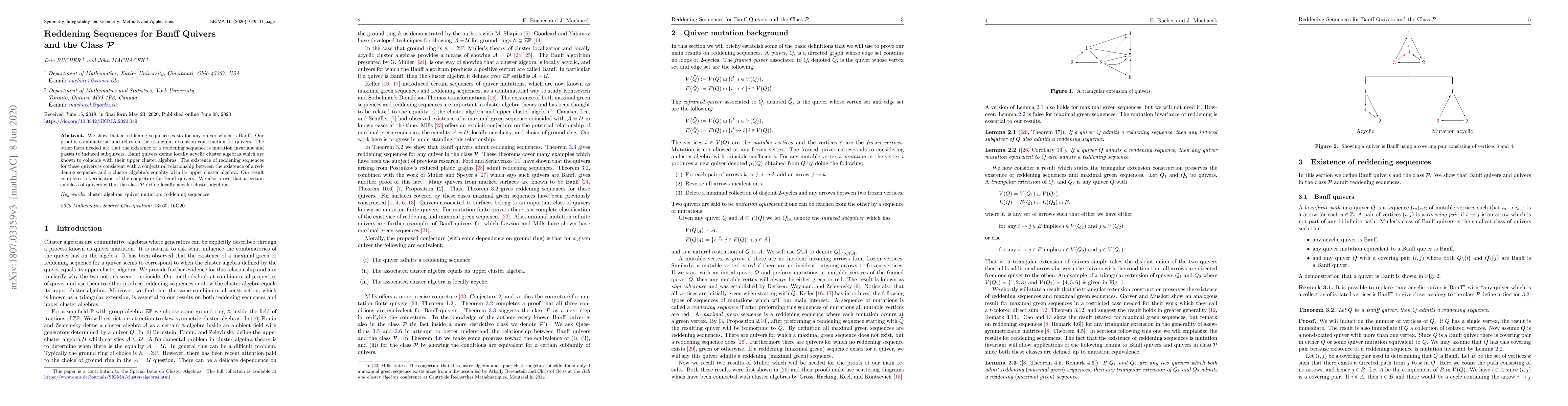 We show that a reddening sequence exists for any quiver which is Banff. Our proof is combinatorial and relies on the triangular extension construction for quivers. The other facts needed are that the existence of a reddening sequence is mutation invariant and passes to induced subquivers. Banff quivers define locally acyclic cluster algebras which are known to coincide with their upper cluster algebras.The existence of reddening sequences for these quivers is consistent with a conjectural relationship between the existence of a reddening sequence and a cluster algebra's equality with its upper cluster algebra.Our result completes a verification of the conjecture for Banff quivers. We also prove that a certain subclass of quivers within the class $\mathcal{P}$ define locally acyclic cluster algebras.
