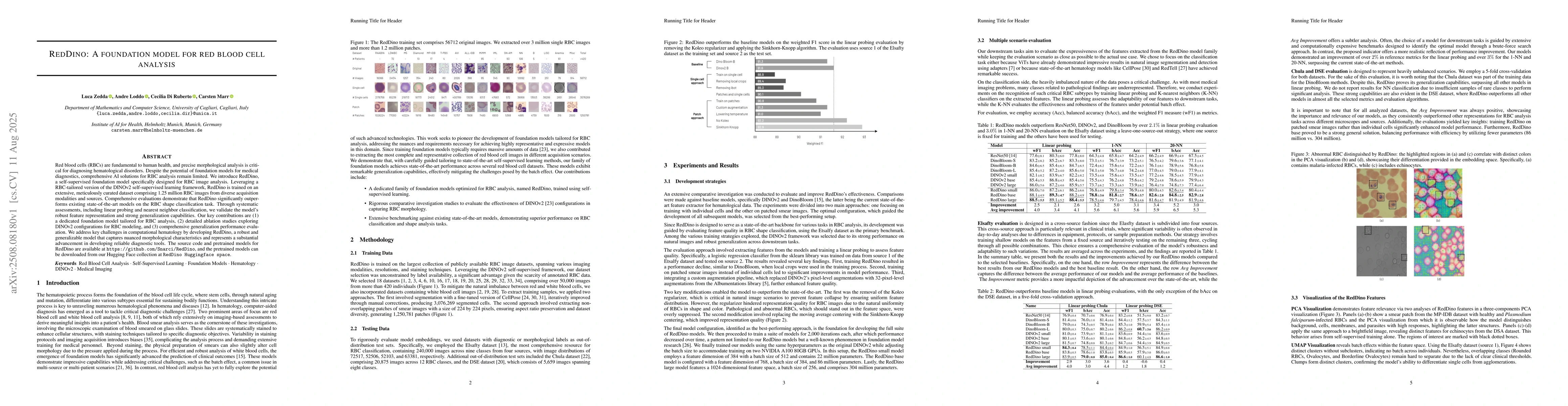 This research is significant as it presents RedDino, a foundation model tailored for RBC analysis, addressing the scarcity of comprehensive AI solutions in computational hematology. RedDino captures nuanced morphological features, advancing the development of reliable diagnostic tools for hematological disorders.