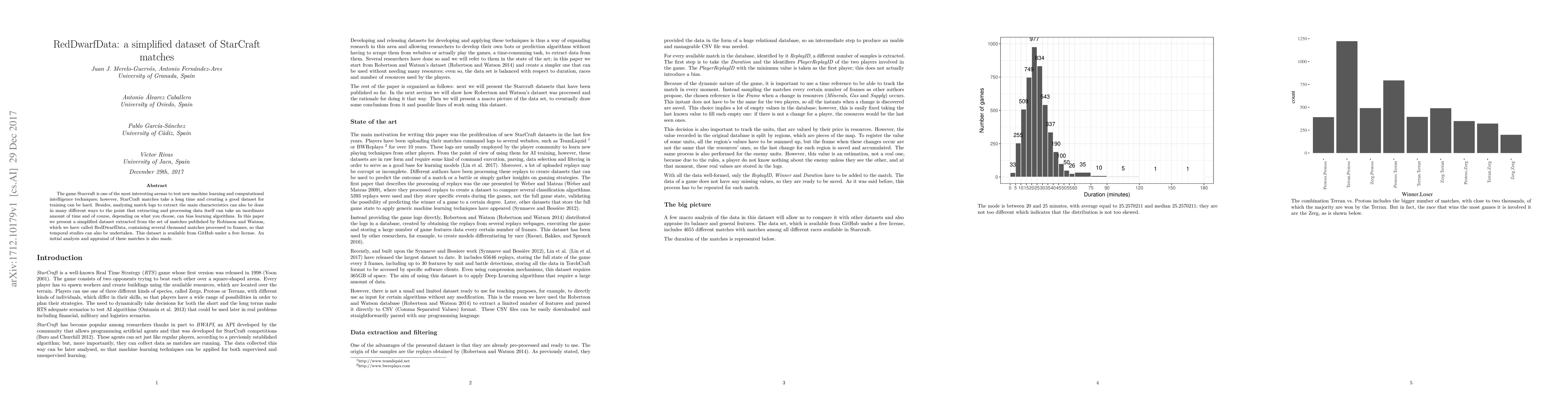 RedDwarfData is a simplified dataset derived from StarCraft matches, designed to facilitate machine learning research by reducing the time and complexity of data extraction and processing. The dataset is publicly available and includes several thousand matches processed to frames for temporal studies.