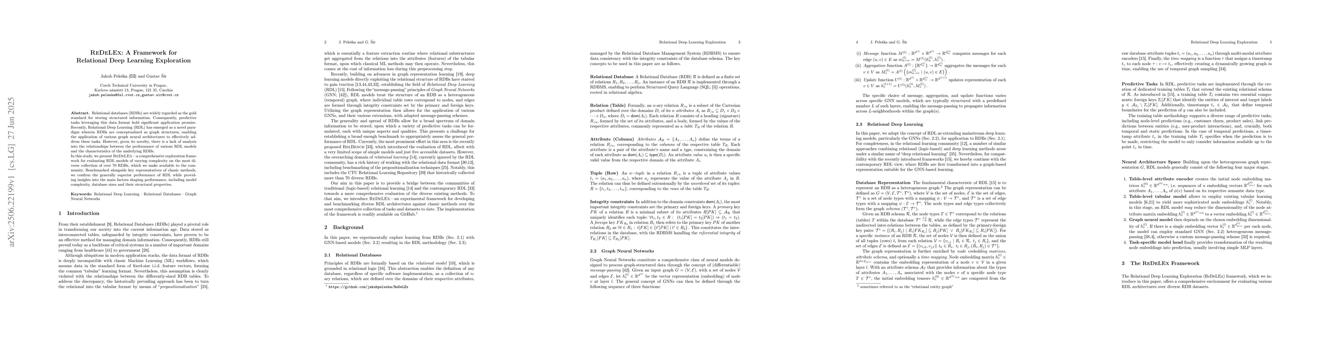 Relational databases (RDBs) are widely regarded as the gold standard for storing structured information. Consequently, predictive tasks leveraging this data format hold significant application promise. Recently, Relational Deep Learning (RDL) has emerged as a novel paradigm wherein RDBs are conceptualized as graph structures, enabling the application of various graph neural architectures to effectively address these tasks. However, given its novelty, there is a lack of analysis into the relationships between the performance of various RDL models and the characteristics of the underlying RDBs. In this study, we present REDELEX$-$a comprehensive exploration framework for evaluating RDL models of varying complexity on the most diverse collection of over 70 RDBs, which we make available to the community. Benchmarked alongside key representatives of classic methods, we confirm the generally superior performance of RDL while providing insights into the main factors shaping performance, including model complexity, database sizes and their structural properties.