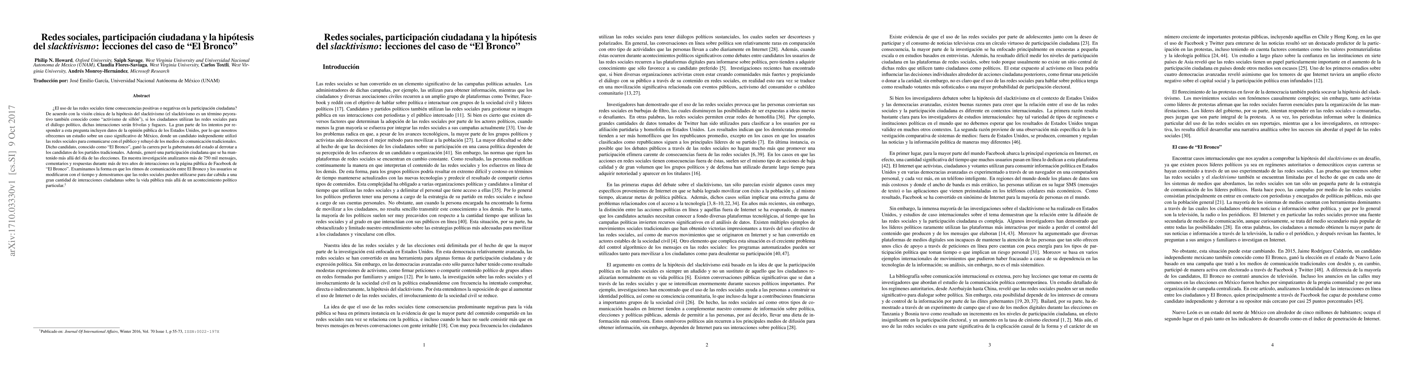 Este estudio examina el impacto de las redes sociales en la participación ciudadana en México, centrándose en el candidato independiente "El Bronco". Analiza más de 750,000 interacciones en su página de Facebook, demostrando que las redes sociales pueden fomentar una participación ciudadana sostenida más allá de eventos políticos, desafiando la hipótesis del "slacktivismo".
