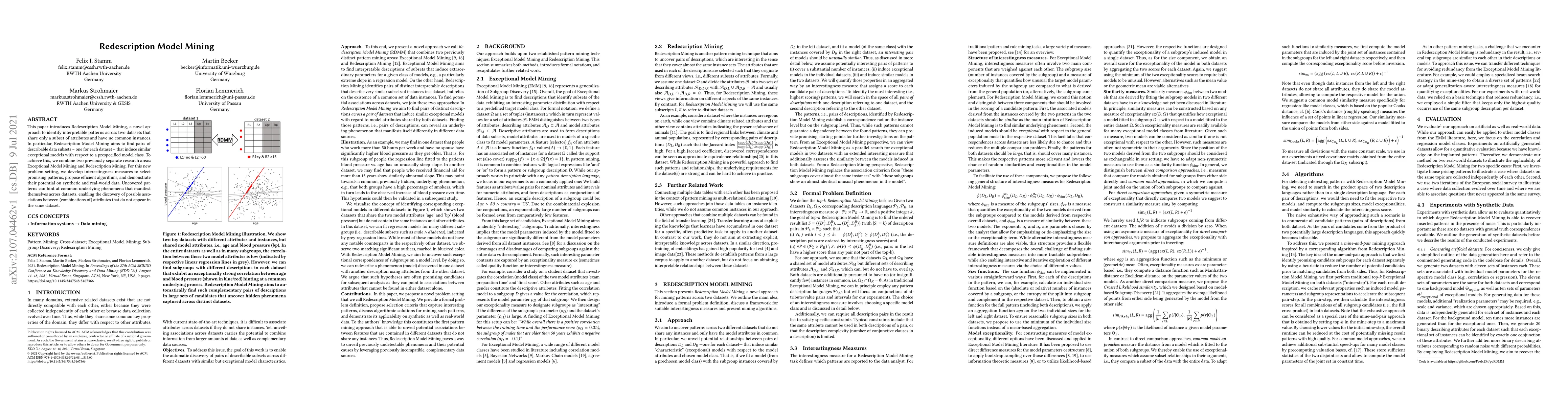 This paper presents Redescription Model Mining, a method to identify interpretable patterns across two disparate datasets by finding similar exceptional models within subsets of each dataset. It combines Exceptional Model Mining and Redescription Mining, proposing new interestingness measures and algorithms to uncover potential associations between attributes across datasets.