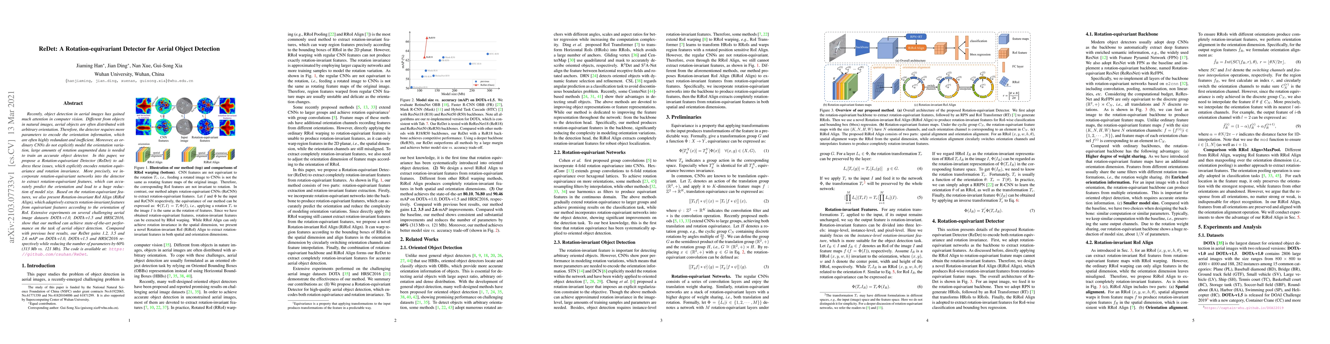 ReDet introduces a novel approach to aerial object detection by explicitly modeling rotation equivariance and invariance, reducing redundant parameters, and requiring less rotation-augmented data for training.