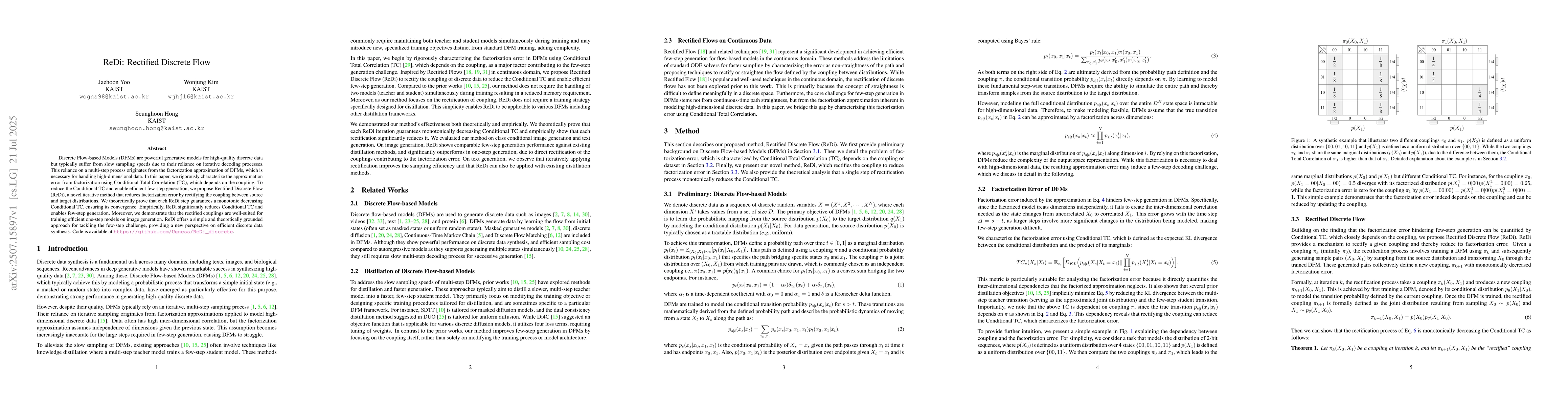 The paper introduces Rectified Discrete Flow (ReDi), an iterative method that reduces factorization error in Discrete Flow-based Models (DFMs) by rectifying the coupling between source and target distributions. It rigorously characterizes the approximation error using Conditional Total Correlation (TC) and proves that each ReDi step guarantees a monotonic decreasing TC, ensuring convergence.