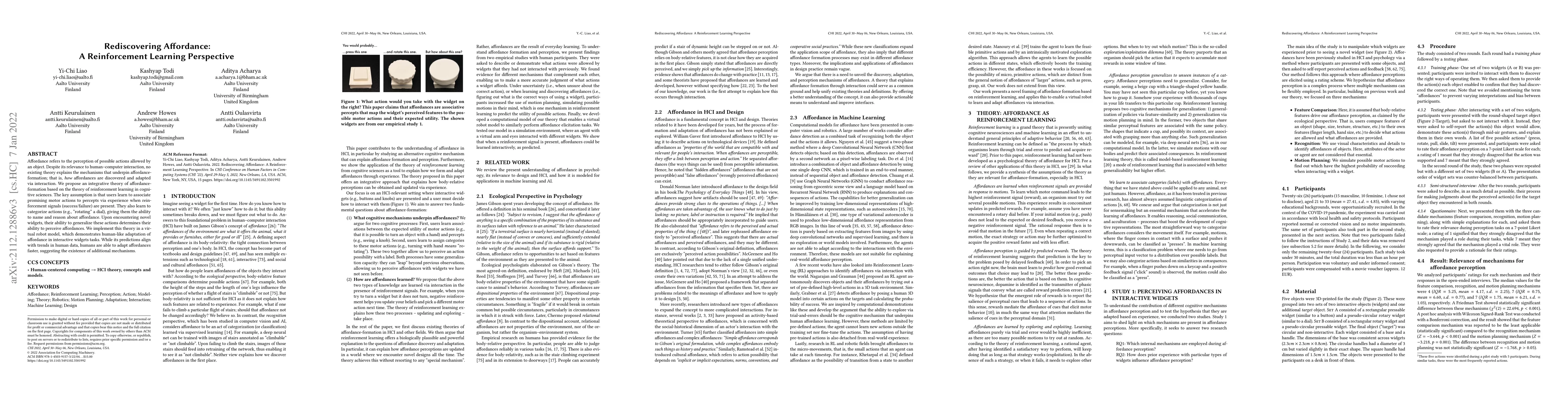 Affordance refers to the perception of possible actions allowed by an object. Despite its relevance to human-computer interaction, no existing theory explains the mechanisms that underpin affordance-formation; that is, how affordances are discovered and adapted via interaction. We propose an integrative theory of affordance-formation based on the theory of reinforcement learning in cognitive sciences. The key assumption is that users learn to associate promising motor actions to percepts via experience when reinforcement signals (success/failure) are present. They also learn to categorize actions (e.g., "rotating" a dial), giving them the ability to name and reason about affordance. Upon encountering novel widgets, their ability to generalize these actions determines their ability to perceive affordances. We implement this theory in a virtual robot model, which demonstrates human-like adaptation of affordance in interactive widgets tasks. While its predictions align with trends in human data, humans are able to adapt affordances faster, suggesting the existence of additional mechanisms.