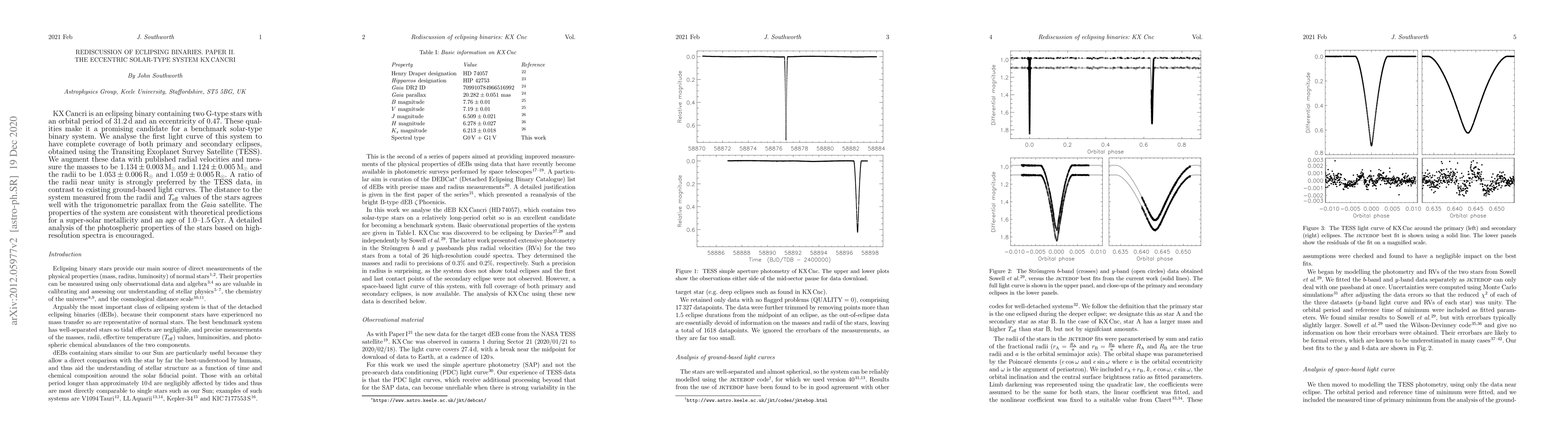 KX Cancri is an eclipsing binary containing two G-type stars with an orbital period of 31.2 d and an eccentricity of 0.47. These qualities make it a promising candidate for a benchmark solar-type binary system. We analyse the first light curve of this system to have complete coverage of both primary and secondary eclipses, obtained using the Transiting Exoplanet Survey Satellite (TESS). We augment these data with published radial velocities and measure the masses to be 1.134 +/- 0.003 Msun and 1.124 +/- 0.005 Msun and the radii to be 1.053 +/- 0.006 Rsun and 1.059 +/- 0.005 Rsun. A ratio of the radii near unity is strongly preferred by the TESS data, in contrast to existing ground-based light curves. The distance to the system measured from the radii and Teff values of the stars agrees well with the trigonometric parallax from the Gaia satellite. The properties of the system are consistent with theoretical predictions for a super-solar metallicity and an age of 1.0 to 1.5 Gyr. A detailed analysis of the photospheric properties of the stars based on high-resolution spectra is encouraged.