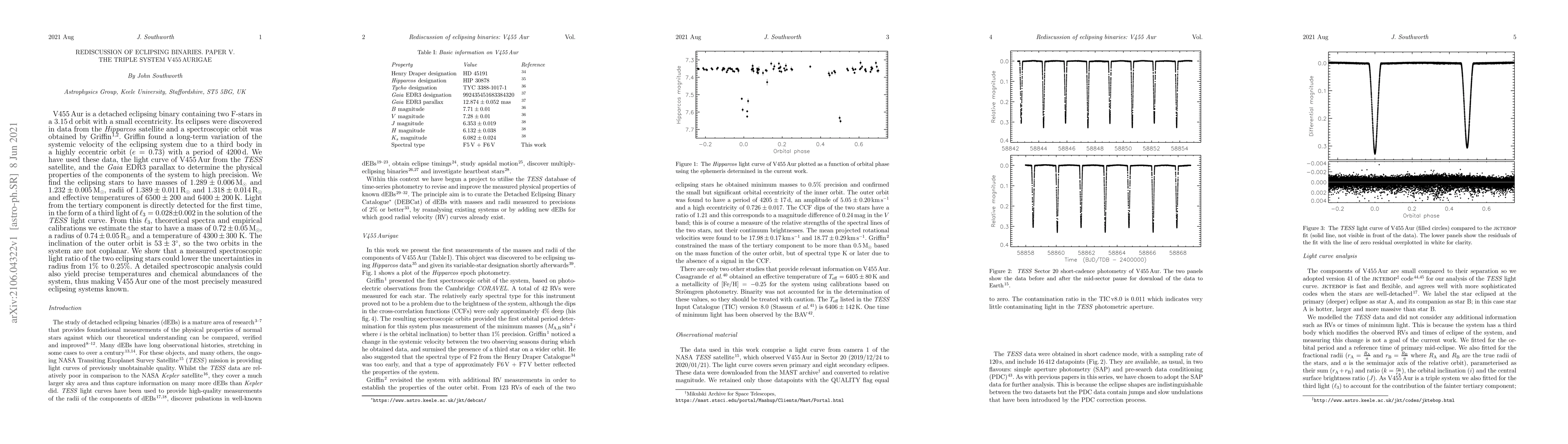 V455 Aur is a detached eclipsing binary containing two F-stars in a 3.15-d orbit with a small eccentricity. Its eclipses were discovered in data from the Hipparcos satellite and a spectroscopic orbit was obtained by Griffin (2001, 2013). Griffin found a long-term variation of the systemic velocity of the eclipsing system due to a third body in a highly eccentric orbit (e = 0.73) with a period of 4200 d. We have used these data, the light curve of V455 Aur from the TESS satellite, and the Gaia EDR3 parallax to determine the physical properties of the components of the system to high precision. We find the eclipsing stars to have masses of 1.289 +/- 0.006 Msun and 1.232 +/- 0.005 Msun, radii of 1.389 +/- 0.011 Rsun and 1.318 +/- 0.014 Rsun and effective temperatures of 6500 +/- 200 and 6400 +/- 200 K. Light from the tertiary component is directly detected for the first time, in the form of a third light of l_3 = 0.028 +/- 0.002 in the solution of the TESS light curve. From this l_3, theoretical spectra and empirical calibrations we estimate the star to have a mass of 0.72 +/- 0.05 Msun, a radius of 0.74 +/- 0.05 Rsun and a temperature of 4300 +/- 300 K. The inclination of the outer orbit is 53 +/- 3 degrees, so the two orbits in the system are not coplanar. We show that a measured spectroscopic light ratio of the two eclipsing stars could lower the uncertainties in radius from 1% to 0.25%. A detailed spectroscopic analysis could also yield precise temperatures and chemical abundances of the system, thus making V455 Aur one of the most precisely measured eclipsing systems known.