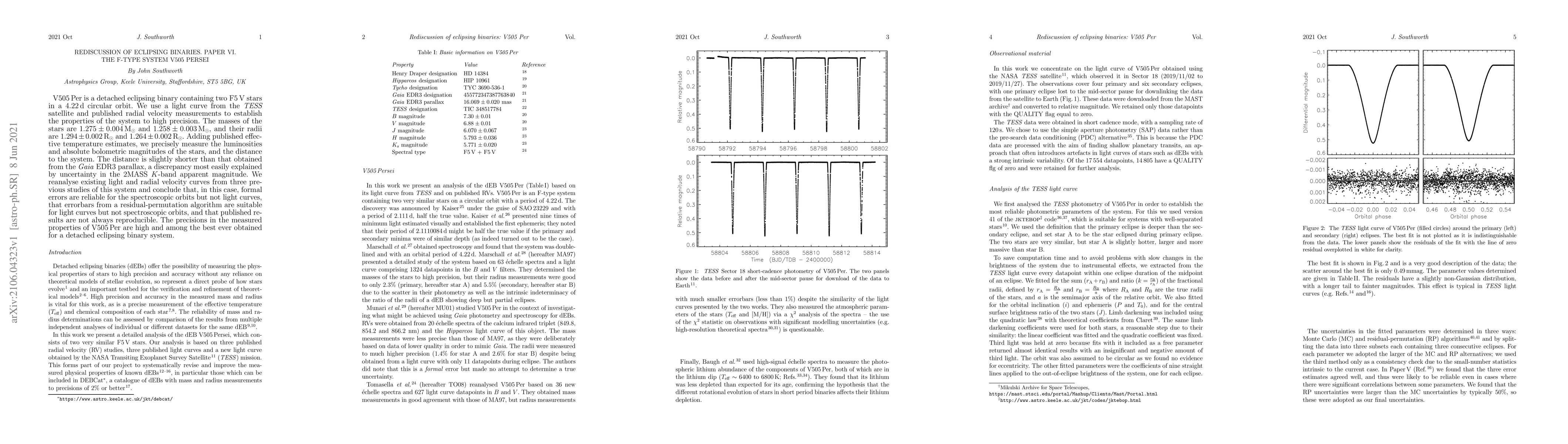 V505 Per is a detached eclipsing binary containing two F5 V stars in a 4.22-d circular orbit. We use a light curve from the TESS satellite and published radial velocity measurements to establish the properties of the system to high precision. The masses of the stars are 1.275 +/- 0.004 Msun and 1.258 +/- 0.003 Msun, and their radii are 1.294 +/- 0.002 Rsun and 1.264 +/- 0.002 Rsun. Adding published effective temperature estimates, we precisely measure the luminosities and absolute bolometric magnitudes of the stars, and the distance to the system. The distance is slightly shorter than that obtained from the Gaia EDR3 parallax, a discrepancy most easily explained by uncertainty in the 2MASS K-band apparent magnitude. We reanalyse existing light and radial velocity curves from three previous studies of this system and conclude that, in this case, formal errors are reliable for the spectroscopic orbits but not light curves, that errorbars from a residual-permutation algorithm are suitable for light curves but not spectroscopic orbits, and that published results are not always reproducible. The precisions in the measured properties of V505 Per are high and among the best ever obtained for a detached eclipsing binary system.