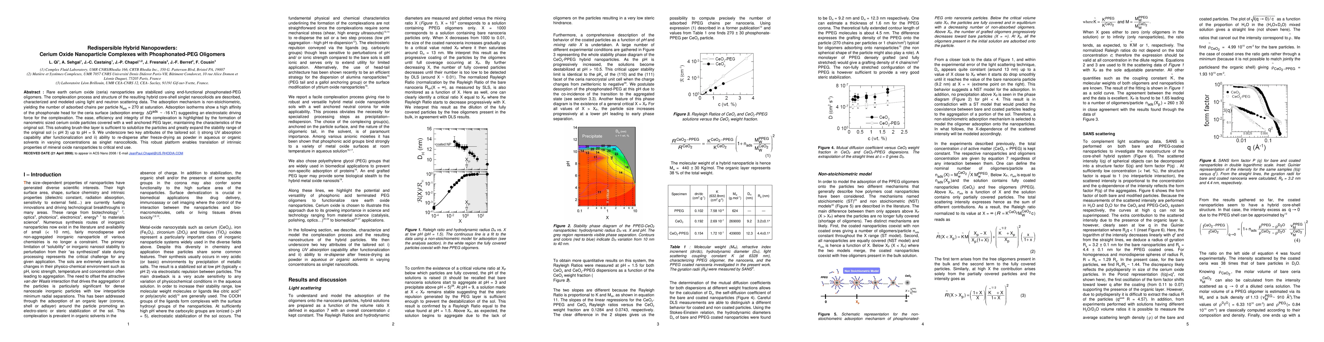 This paper describes the stabilization of cerium oxide nanoparticles using phosphonated-PEG oligomers, forming hybrid nanocolloids with enhanced stability and redispersibility. The resulting nanopowders exhibit strong UV absorption and can be re-dispersed in various solvents after freeze-drying.