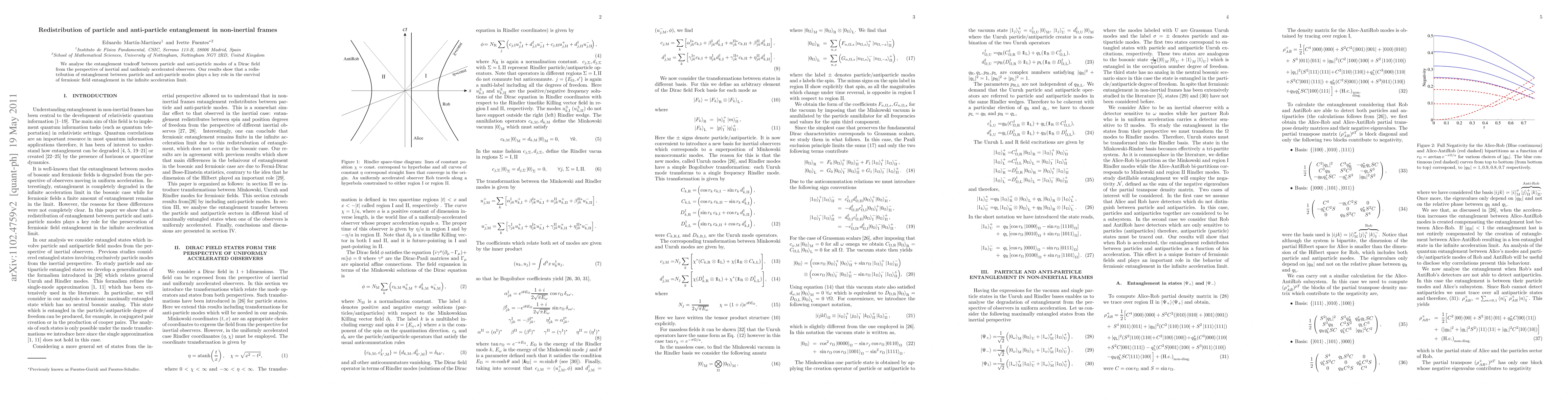 Summary: This paper investigates how entanglement between particle and anti-particle modes of a Dirac field is redistributed in non-inertial frames, revealing that in the infinite acceleration limit, this redistribution is crucial for maintaining entanglement in fermionic fields.