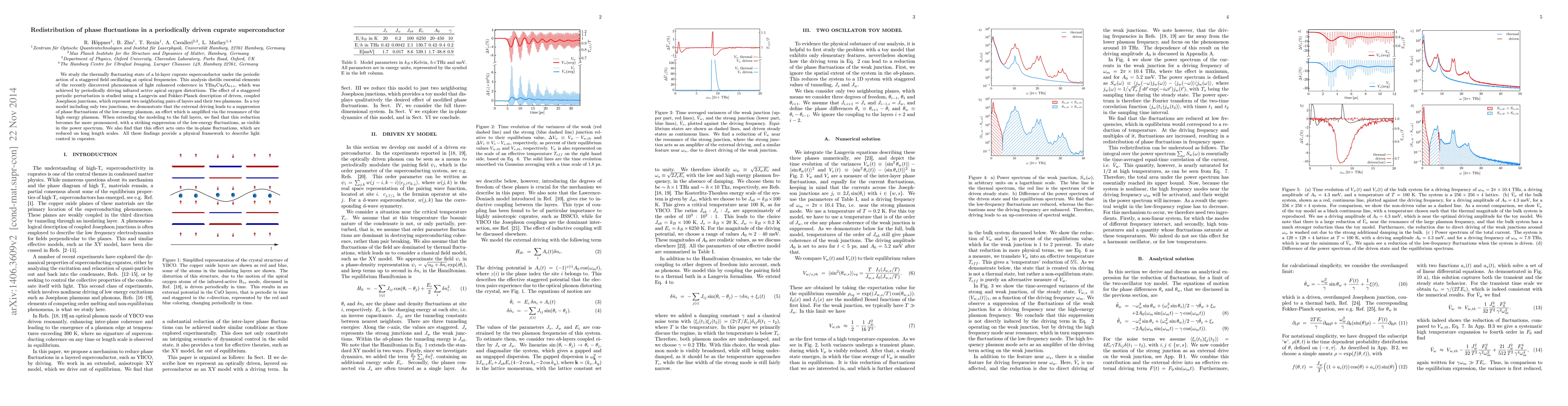 We study the thermally fluctuating state of a bi-layer cuprate superconductor under the periodic action of a staggered field oscillating at optical frequencies. This analysis distills essential elements of the recently discovered phenomenon of light enhanced coherence in YBa$_2$Cu$_3$O$_{6+x}$, which was achieved by periodically driving infrared active apical oxygen distortions. The effect of a staggered periodic perturbation is studied using a Langevin and Fokker-Planck description of driven, coupled Josephson junctions, which represent two neighboring pairs of layers and their two plasmons. In a toy model including only two junctions, we demonstrate that the external driving leads to a suppression of phase fluctuations of the low-energy plasmon, an effect which is amplified via the resonance of the high energy plasmon. When extending the modeling to the full layers, we find that this reduction becomes far more pronounced, with a striking suppression of the low-energy fluctuations, as visible in the power spectrum. We also find that this effect acts onto the in-plane fluctuations, which are reduced on long length scales. All these findings provide a physical framework to describe light control in cuprates.