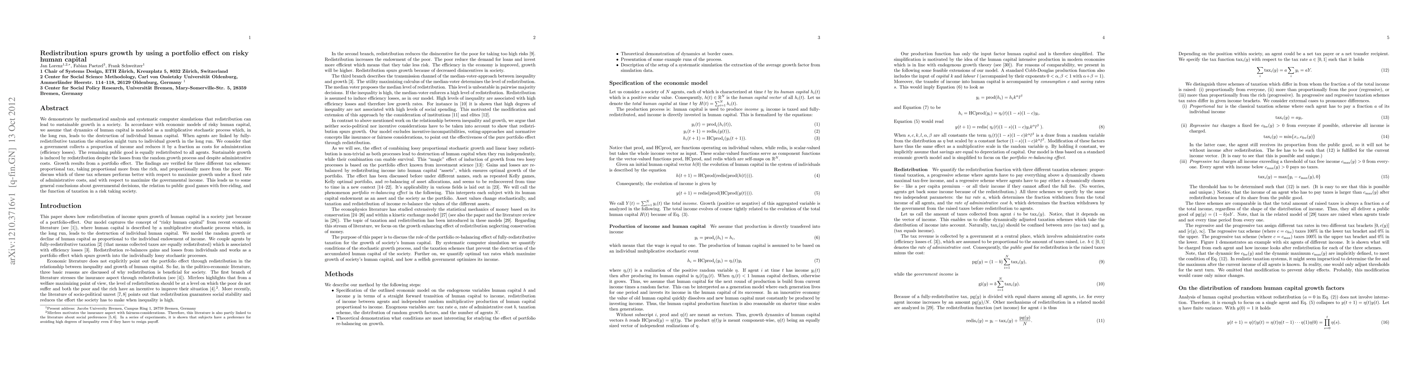 This research uses mathematical analysis and computer simulations to show that redistribution, via fully-redistributive taxation, can transform individual human capital destruction into sustainable growth. The study explains this effect as a portfolio rebalancing, verified for different tax schemes. It also discusses optimal tax schemes for maximizing growth or government income, with implications for governmental decisions and public good games.