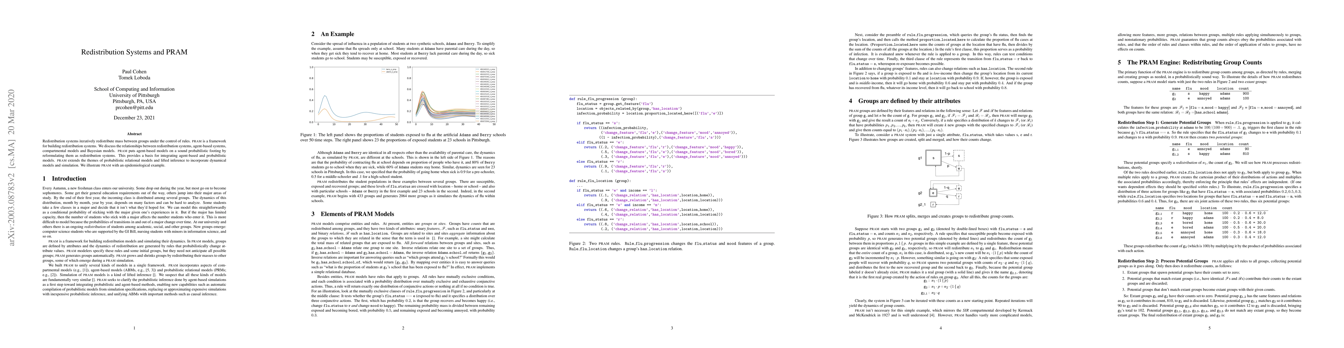 Redistribution systems iteratively redistribute mass between groups under the control of rules. PRAM is a framework for building redistribution systems. We discuss the relationships between redistribution systems, agent-based systems, compartmental models and Bayesian models. PRAM puts agent-based models on a sound probabilistic footing by reformulating them as redistribution systems. This provides a basis for integrating agent-based and probabilistic models. \pram/ extends the themes of probabilistic relational models and lifted inference to incorporate dynamical models and simulation. We illustrate PRAM with an epidemiological example.