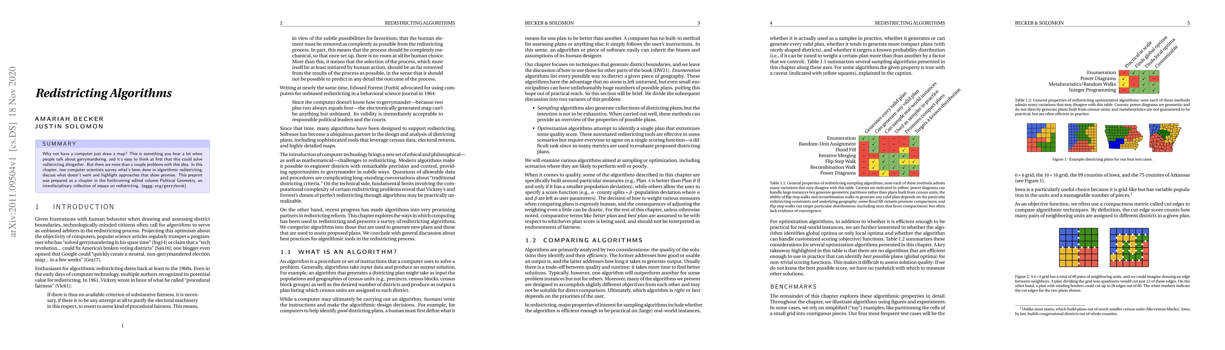 Why not have a computer just draw a map? This is something you hear a lot when people talk about gerrymandering, and it's easy to think at first that this could solve redistricting altogether. But there are more than a couple problems with this idea. In this chapter, two computer scientists survey what's been done in algorithmic redistricting, discuss what doesn't work and highlight approaches that show promise. This preprint was prepared as a chapter in the forthcoming edited volume Political Geometry, an interdisciplinary collection of essays on redistricting. (https://mggg.org/gerrybook)