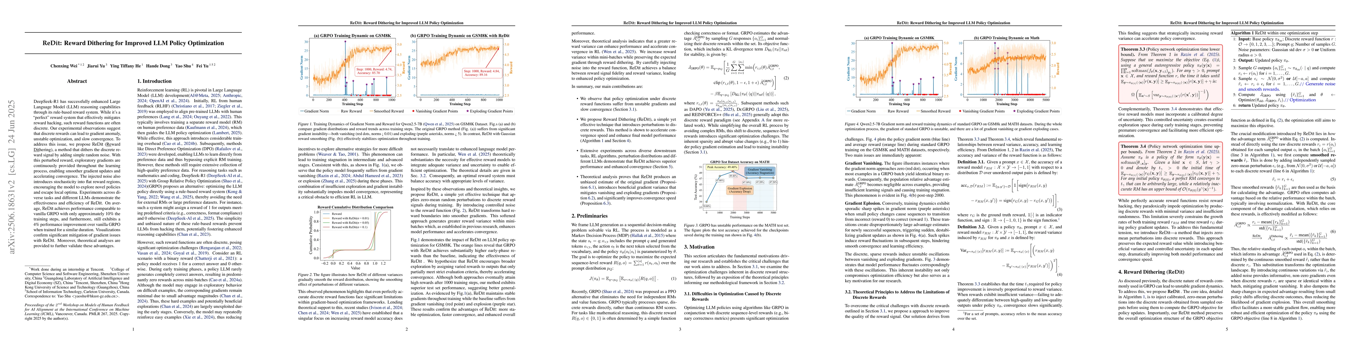 DeepSeek-R1 has successfully enhanced Large Language Model (LLM) reasoning capabilities through its rule-based reward system. While it's a ''perfect'' reward system that effectively mitigates reward hacking, such reward functions are often discrete. Our experimental observations suggest that discrete rewards can lead to gradient anomaly, unstable optimization, and slow convergence. To address this issue, we propose ReDit (Reward Dithering), a method that dithers the discrete reward signal by adding simple random noise. With this perturbed reward, exploratory gradients are continuously provided throughout the learning process, enabling smoother gradient updates and accelerating convergence. The injected noise also introduces stochasticity into flat reward regions, encouraging the model to explore novel policies and escape local optima. Experiments across diverse tasks demonstrate the effectiveness and efficiency of ReDit. On average, ReDit achieves performance comparable to vanilla GRPO with only approximately 10% the training steps, and furthermore, still exhibits a 4% performance improvement over vanilla GRPO when trained for a similar duration. Visualizations confirm significant mitigation of gradient issues with ReDit. Moreover, theoretical analyses are provided to further validate these advantages.