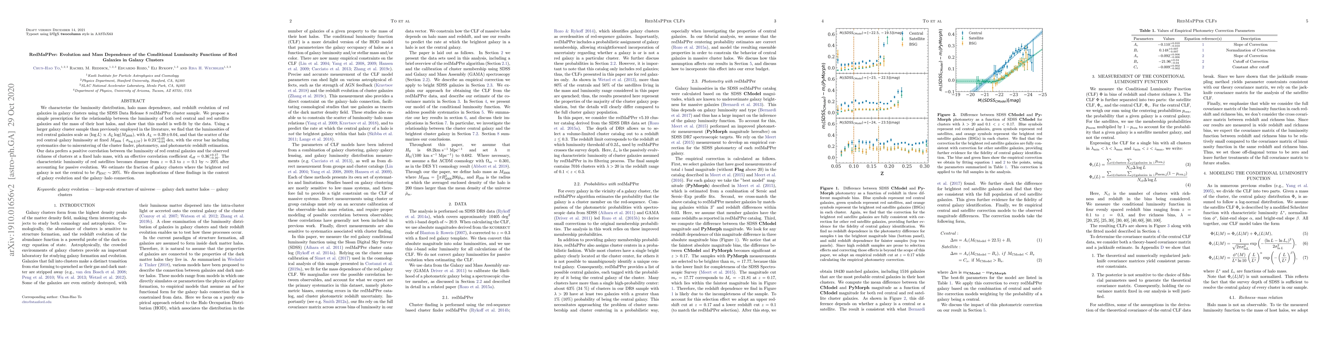 We characterize the luminosity distribution, halo mass dependence, and redshift evolution of red galaxies in galaxy clusters using the SDSS Data Release 8 RedMaPPer cluster sample. We propose a simple prescription for the relationship between the luminosity of both central and satellite galaxies and the mass of their host halos, and show that this model is well-fit by the data. Using a larger galaxy cluster sample than previously employed in the literature, we find that the luminosities of central galaxies scale as $\langle \log L \rangle \propto A_L \log (M_{200b})$, with $A_L=0.39\pm0.04$, and that the scatter of the central--galaxy luminosity at fixed $M_{200b}$ ( $\sigma_{\log L|M}$) is $0.23 ^{+0.05}_{-0.04}$ dex, with the error bar including systematics due to miscentering of the cluster finder, photometry, and photometric redshift estimation. Our data prefers a positive correlation between the luminosity of central galaxies and the observed richness of clusters at a fixed halo mass, with an effective correlation coefficient $d_{\rm{eff}}=0.36^{+0.17}_{-0.16}$. The characteristic luminosity of satellites becomes dimmer from $z=0.3$ to $z=0.1$ by $\sim 20\%$ after accounting for passive evolution. We estimate the fraction of galaxy clusters where the brightest galaxy is not the central to be $P_{\rm{BNC}} \sim 20\%$. We discuss implications of these findings in the context of galaxy evolution and the galaxy--halo connection.