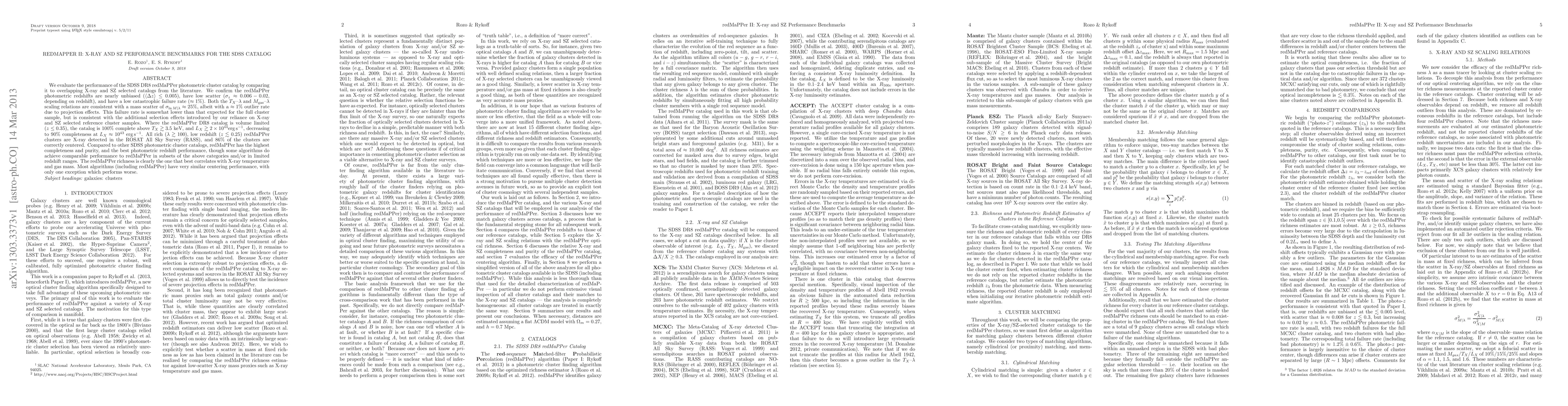 This paper benchmarks the SDSS DR8 redMaPPer photometric cluster catalog, confirming its nearly unbiased and low-scatter photometric redshifts, high completeness, and purity. It shows the best performance in correlating richness with X-ray temperature and gas mass compared to other SDSS catalogs.