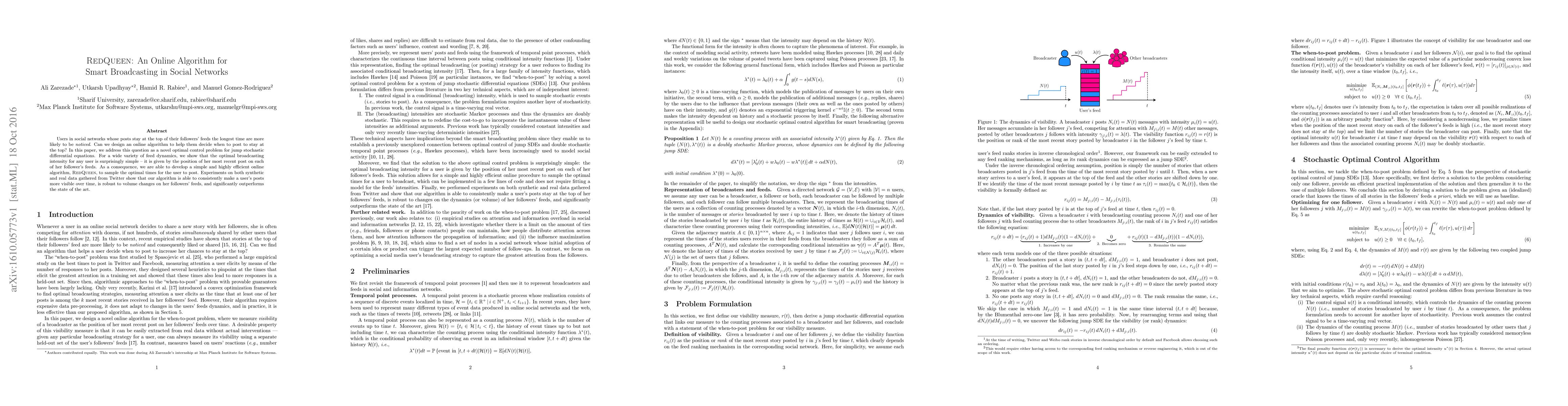 Users in social networks whose posts stay at the top of their followers'{} feeds the longest time are more likely to be noticed. Can we design an online algorithm to help them decide when to post to stay at the top? In this paper, we address this question as a novel optimal control problem for jump stochastic differential equations. For a wide variety of feed dynamics, we show that the optimal broadcasting intensity for any user is surprisingly simple -- it is given by the position of her most recent post on each of her follower's feeds. As a consequence, we are able to develop a simple and highly efficient online algorithm, RedQueen, to sample the optimal times for the user to post. Experiments on both synthetic and real data gathered from Twitter show that our algorithm is able to consistently make a user's posts more visible over time, is robust to volume changes on her followers' feeds, and significantly outperforms the state of the art.