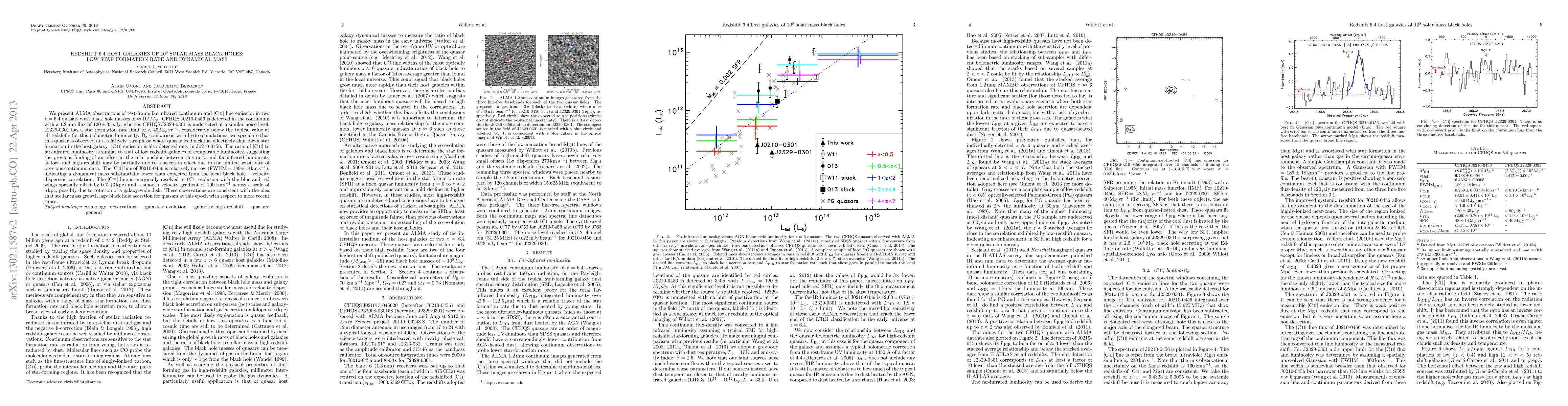 We present ALMA observations of rest-frame far-infrared continuum and [CII] line emission in two z=6.4 quasars with black hole masses of ~10^8 M_sun. CFHQS J0210-0456 is detected in the continuum with a 1.2 mm flux of 120+/-35 microJy, whereas CFHQS J2329-0301 is undetected at a similar noise level. J2329-0301 has a star formation rate limit of <40 M_sun/yr, considerably below the typical value at all redshifts for this bolometric luminosity. By comparison with hydro simulations, we speculate that this quasar is observed at a relatively rare phase where quasar feedback has effectively shut down star formation in the host galaxy. [CII] emission is also detected only in J0210-0456. The ratio of [CII] to far-infrared luminosity is similar to that of low redshift galaxies of comparable luminosity, suggesting the previous finding of an offset in the relationships between this ratio and far-infrared luminosity at low- and high-redshift may be partially due to a selection effect from the limited sensitivity of previous observations. The [CII] line of J0210-0456 is relatively narrow (FWHM=189+/-18 km/s), indicating a dynamical mass substantially lower than expected from the local black hole - velocity dispersion correlation. The [CII] line is marginally resolved at 0.7" resolution with the blue and red wings spatially offset by 0.5" (3 kpc) and a smooth velocity gradient of 100 km/s across a scale of 6 kpc, possibly due to rotation of a galaxy-wide disk. These observations are consistent with the idea that stellar mass growth lags black hole accretion for quasars at this epoch with respect to more recent times.