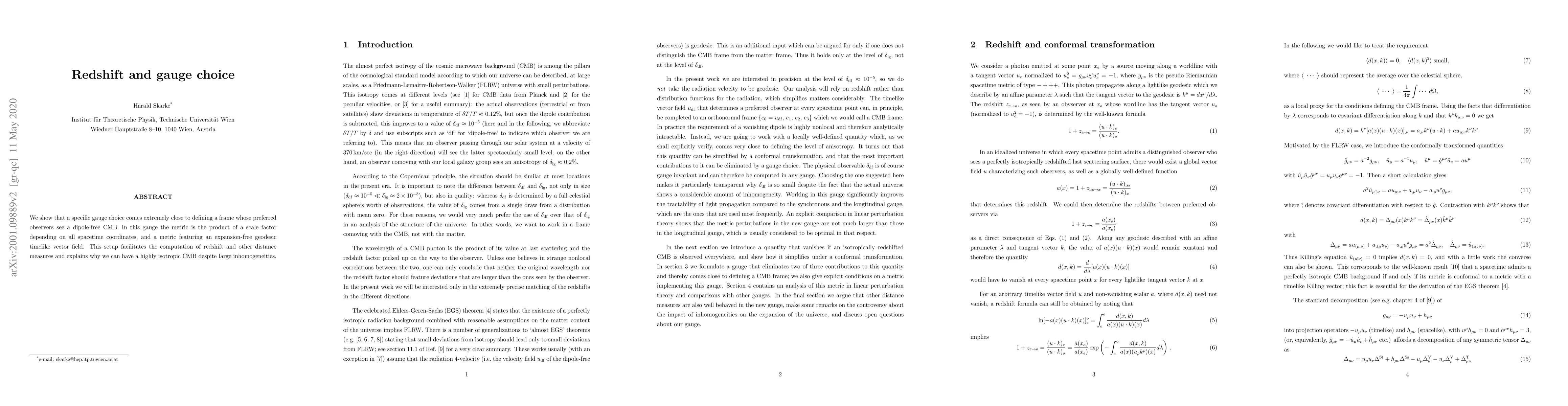 The paper proposes a specific gauge choice that nearly defines a frame where preferred observers see a dipole-free CMB. It utilizes a metric as a product of a scale factor dependent on all spacetime coordinates and a metric with an expansion-free geodesic timelike vector field, facilitating redshift and distance measure computations.