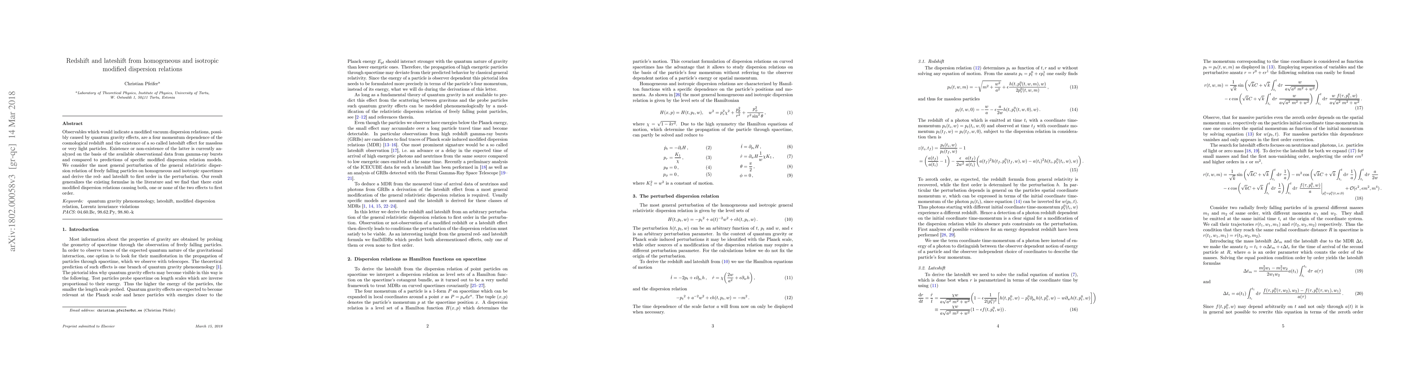 Observables which would indicate a modified vacuum dispersion relations, possibly caused by quantum gravity effects, are a four momentum dependence of the cosmological redshift and the existence of a so called lateshift effect for massless or very light particles. Existence or non-existence of the later is currently analyzed on the basis of the available observational data from gamma ray bursts and compared to predictions of specific modified dispersion relation models. We consider the most general perturbation of the general relativistic dispersion relation of freely falling particles on homogeneous and isotropic spacetimes and derive the red- and lateshift to first order in the perturbation. Our result generalizes the existing formulae in the literature and we find that there exist modified dispersion relations causing both, one or none of the two effects to first order.