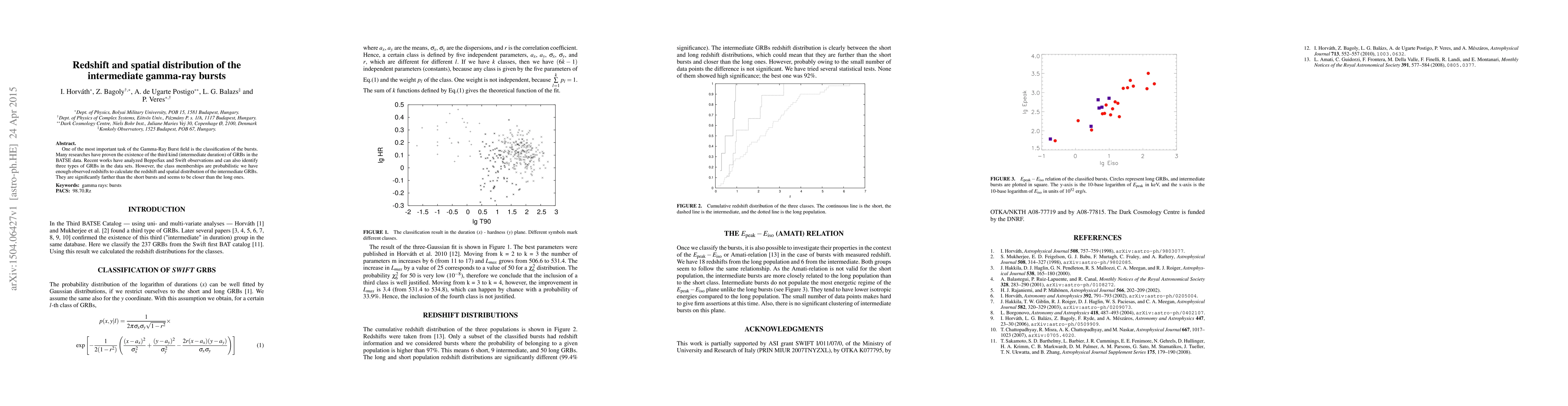 This paper investigates the classification and spatial distribution of intermediate gamma-ray bursts (GRBs), identifying them as distinct from short and long GRBs based on observed redshifts. Intermediate GRBs are found to be farther than short GRBs but closer than long GRBs in terms of their spatial distribution.