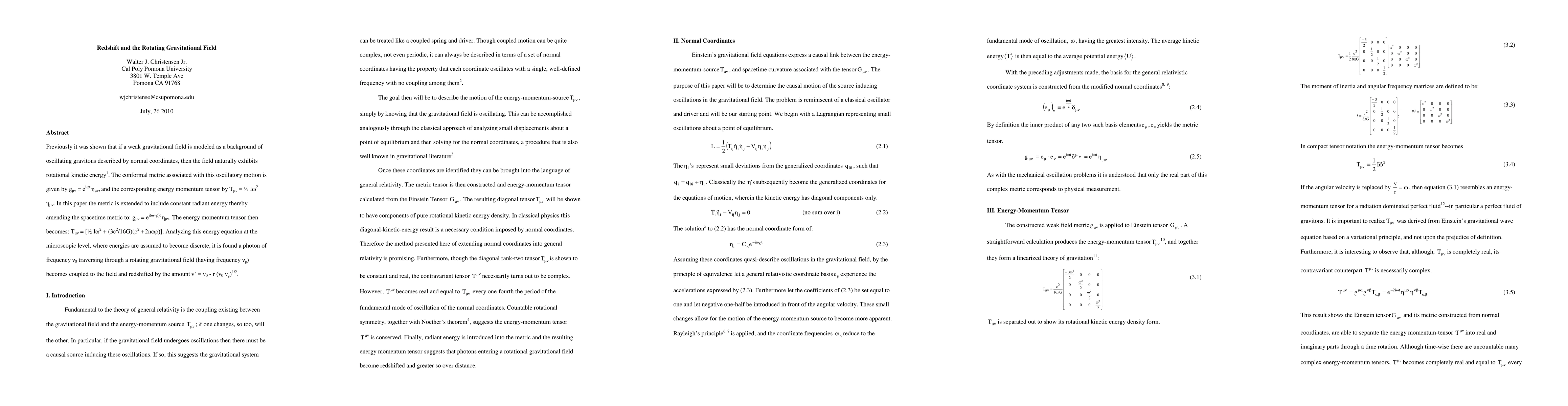 Previously it was shown that if a weak gravitational field is modeled as a background of oscillating gravitons described by normal coordinates, then the field naturally exhibits rotational kinetic energy. The conformal metric associated with this oscillatory motion is given by g{\mu}{\nu} = ei{\omega}t {\eta}{\mu}{\nu}, and the corresponding energy momentum tensor by T{\mu}{\nu} = $frac{1}{2}$ I{\omega}2 {\eta}{\mu}{\nu}. In this paper the metric is extended to include constant radiant energy thereby amending the spacetime metric to: g{\mu}{\nu} = ei({\omega}+{\rho})t {\eta}{\mu}{\nu}. The energy momentum tensor then becomes: T{\mu}{\nu} = [$frac{1}{2}$ I{\omega}2 + (3c2/16G)({\rho}2 + 2n{\omega}{\rho})]. Analyzing this energy equation at the microscopic level, where energies are assumed to become discrete, it is found a photon of frequency {\nu}0 traversing through a rotating gravitational field (having frequency {\nu}g) becomes coupled to the field and redshifted by the amount {\nu}' = {\nu}0 - r ({\nu}0 {\nu}g)1/2.