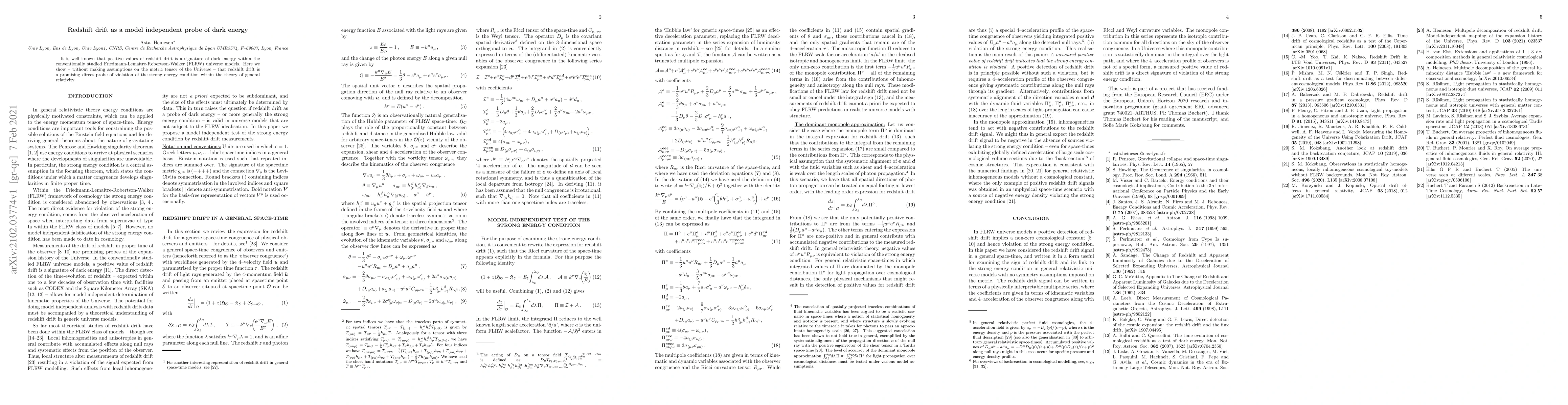 This paper demonstrates that redshift drift, a phenomenon indicating the presence of dark energy, can be used as a model-independent probe of violations of the strong energy condition in general relativity, without requiring assumptions about the universe's metric tensor.