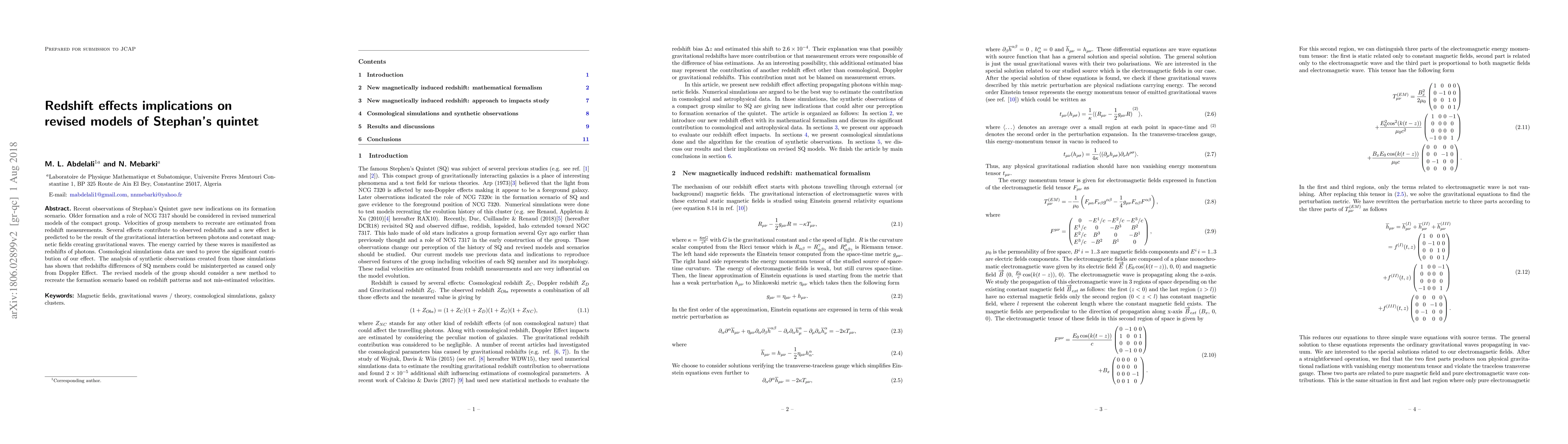 This paper proposes a revised model for Stephan's Quintet, emphasizing the role of gravitational waves from constant magnetic fields in redshift effects, which can be misinterpreted as Doppler shifts. It suggests that these waves contribute to the observed redshifts, necessitating a new approach to accurately recreate the group's formation scenario.