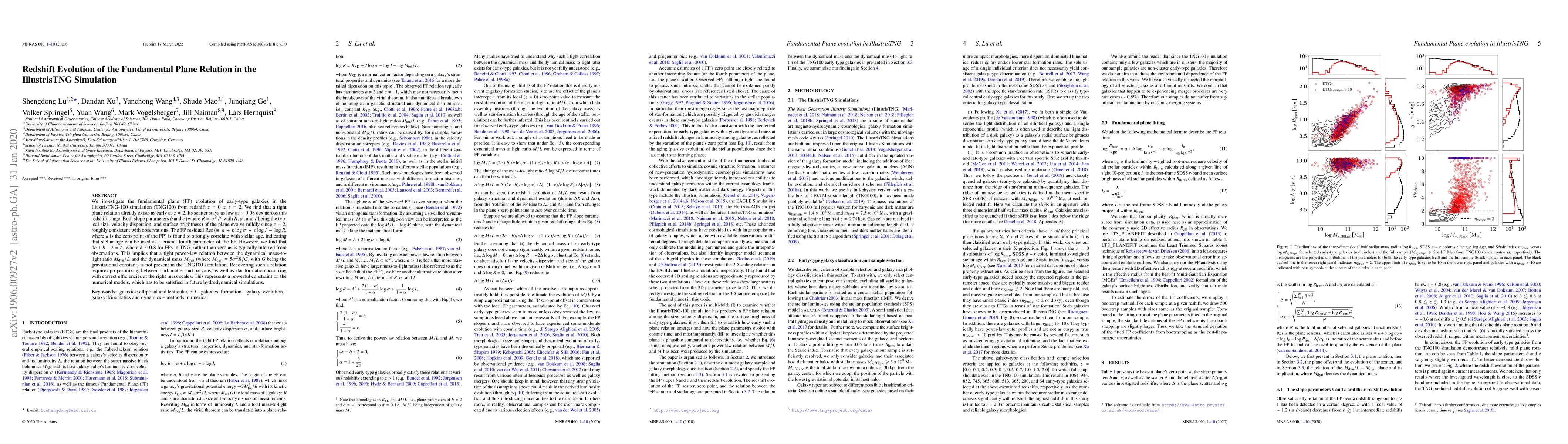 We investigate the fundamental plane (FP) evolution of early-type galaxies in the IllustrisTNG-100 simulation (TNG100) from redshift $z=0$ to $z=2$. We find that a tight plane relation already exists as early as $z=2$. Its scatter stays as low as $\sim 0.08$ dex across this redshift range. Both slope parameters $b$ and $c$ (where $R \propto \sigma^b I^c$ with $R$, $\sigma$, and $I$ being the typical size, velocity dispersion, and surface brightness) of the plane evolve mildly since $z=2$, roughly consistent with observations. The FP residual $\rm Res$ ($\equiv\,a\,+\,b\log \sigma\,+\,c\log I\,-\,\log R$, where $a$ is the zero point of the FP) is found to strongly correlate with stellar age, indicating that stellar age can be used as a crucial fourth parameter of the FP. However, we find that $4c+b+2=\delta$, where $\delta \sim 0.8$ for FPs in TNG, rather than zero as is typically inferred from observations. This implies that a tight power-law relation between the dynamical mass-to-light ratio $M_{\rm dyn}/L$ and the dynamical mass $M_{\rm dyn}$ (where $M_{\rm dyn}\equiv 5\sigma^2R/G$, with $G$ being the gravitational constant) is not present in the TNG100 simulation. Recovering such a relation requires proper mixing between dark matter and baryons, as well as star formation occurring with correct efficiencies at the right mass scales. This represents a powerful constraint on the numerical models, which has to be satisfied in future hydrodynamical simulations.